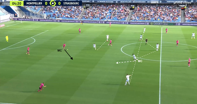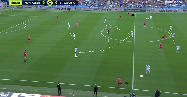 Sur cette image on aperçoit Bellegarde, milieu relayeur, sortir du bloc et déclencher un pressing, car un milieu axial adverse avait le ballon. Ça a été l'élément déclenchateur de pressing à chaque fois que Montpellier avait le ballon dans sa propre moitié. Par exemple, quelques minutes plus tard :