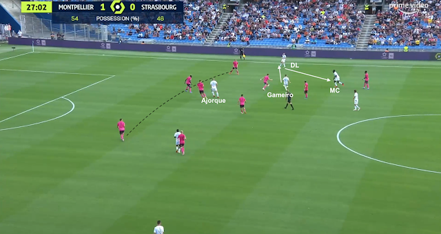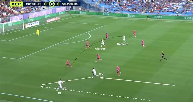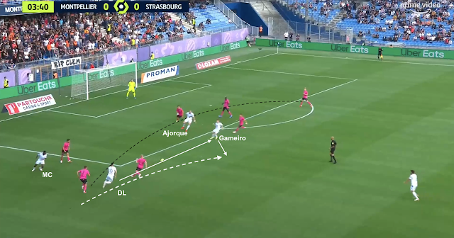 ... et Gameiro qui peut être ainsi trouvé à l'entrée de la surface, pour une combinaison avec le piston. Les déplacements d'Ajorque ont clairement l'objectif de créer de l'espace derrière, où un autre joueur y sera trouvé, et parfois ça paye. Le but de Strasbourg dans ce match est parti d'un mouvement de ce type :