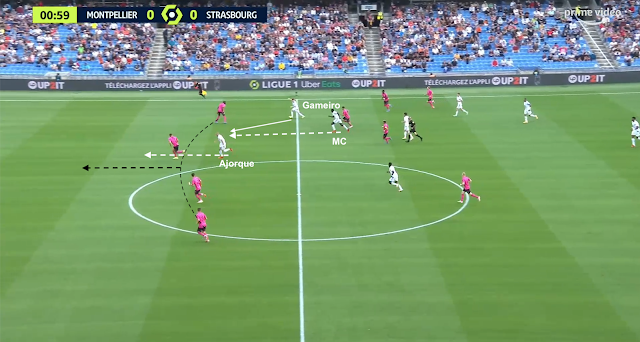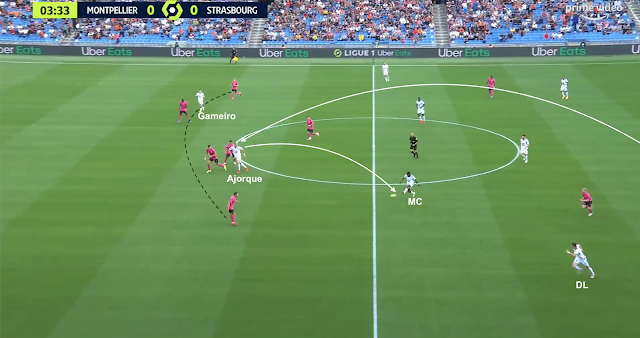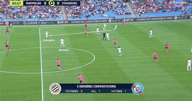 C'est le lancement de jeu habituel pour cette équipe (4 fois dans les premières 5 minutes du match) : long dégagement du gardien à destination d'Ajorque, qui gagne souvent ses duels aériens. Dans ce cas, il arrive donc à passer le ballon à son milieu de terrain, pendant que Gameiro se trouve un peu plus haut. Le jeu continue à gauche...