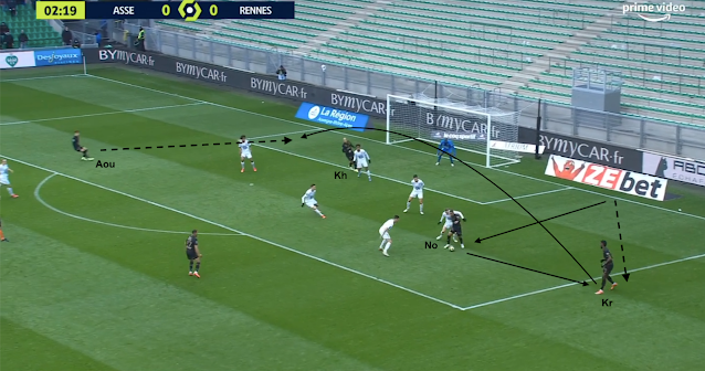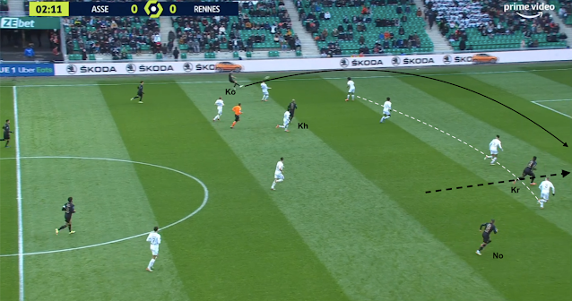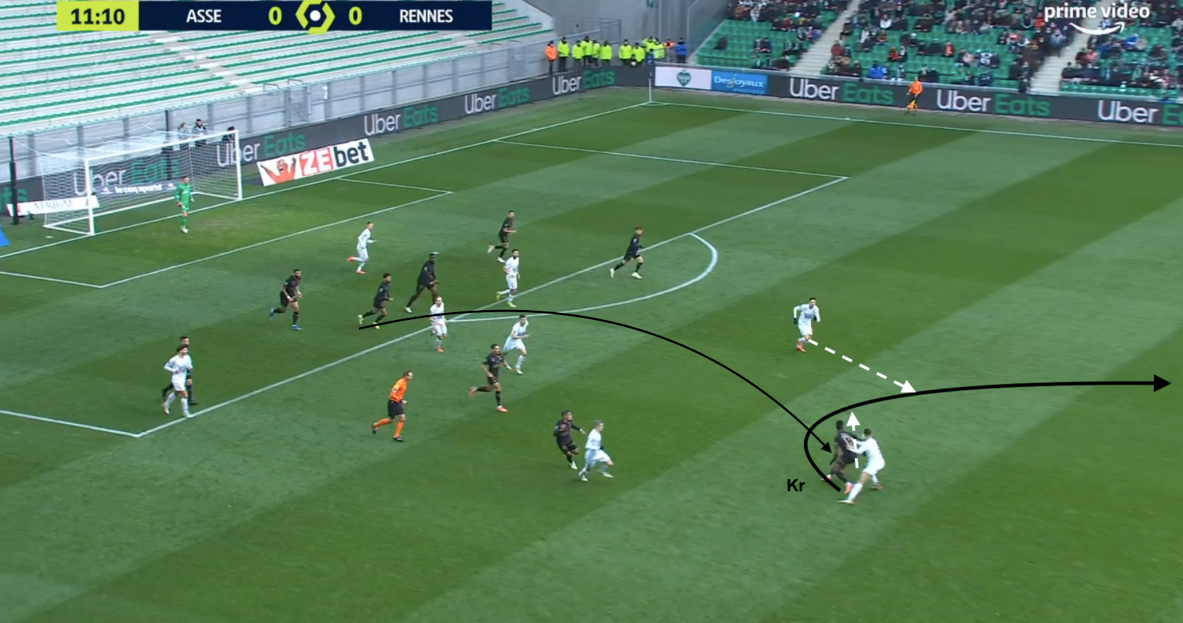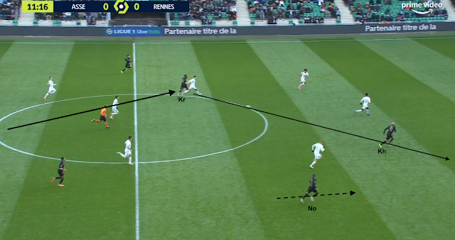 Ces trois exemples sont tous sortis du premier quart d'heure, qui a été d'un bon niveau, avec des Verts plaisants à voir jouer. Et qui se sont effondrés ensuite, en l'espace de 10 minutes qui ont constitué le tournant du match : un but refusé pour hors-jeu à Khazri, la sortie sur blessure de Moukoudi, et deux buts coup sur coup pour les Rennais. Sonnés, les Stéphanois ont été achevés par deux autres buts encaissés juste avant et juste après la pause. La 2MT ne mérite simplement pas le détour pour une analyse.