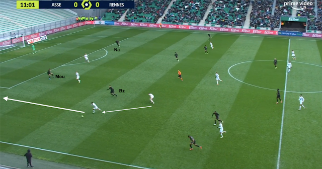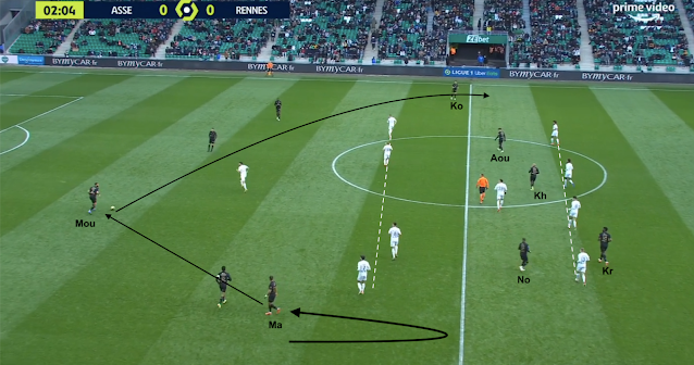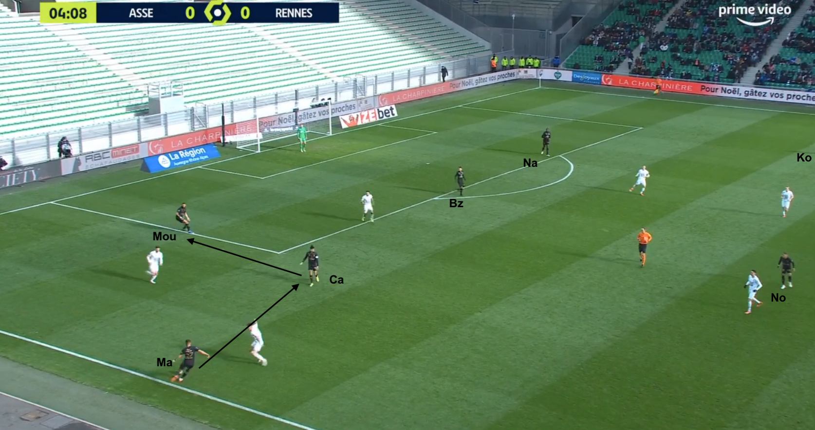 ... et même si Rennes presse haut (6 joueurs dans cette zone), les Stéphanois ne paniquent pas. Maçon joue avec Camara, qui remet à Moukoudi, qui feinte un adversaire...