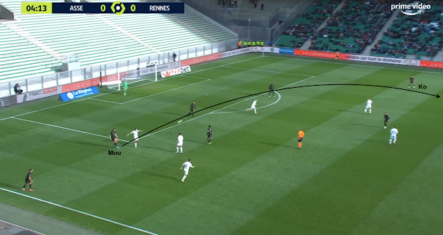 ... et joue en arrière avec Moukoudi. Comme les 4 offensifs sont de ce côté du terrain, le bloc adverse y est aussi, et Kolo est libre à gauche. La transversale de Moukoudi le trouve parfaitement dans cet espace...