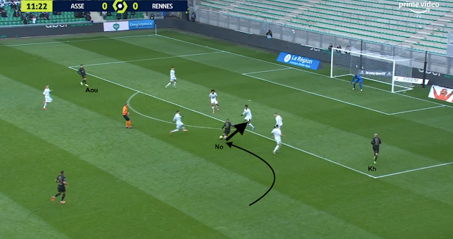 Leur ailier est décalé à gauche, suivi par Boudebouz, pendant que Moukoudi est Nadé doivent surveiller dans l'axe deux adversaires. Heureusement, la phase de transition est ralentie, les Verts reviennent défendre en nombre...