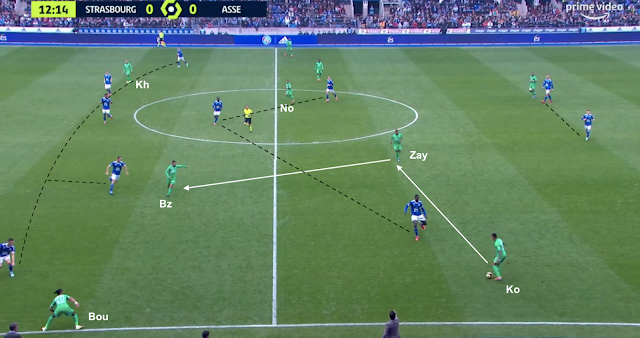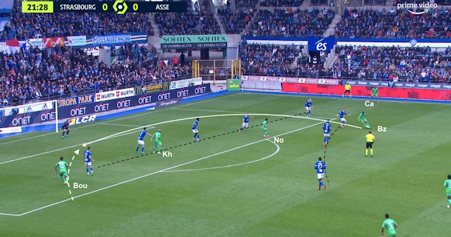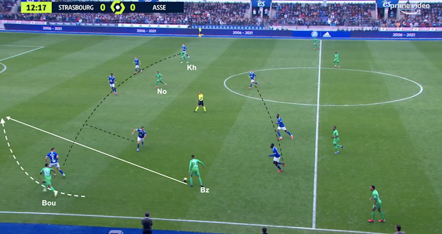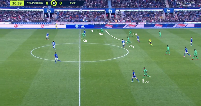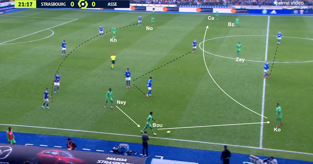 Le bloc strasbourgeois en 5-3-2 est en place, mais le milieu axial droit est en infériorité numérique dans ce coin de terrain. Boudebouz se place bien entre les lignes, tout en montrant à Kolo par où passer. Ce que le latéral stéphanois fait, et via Youssouf, le ballon arrive dans les pieds du meneur de jeu, face au jeu et en position idéale pour servir ses attaquants :
