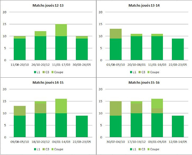 Enfin, la 2015-16 qui vient de finir a de nouveau vu les Verts jouer des tours préliminaires et des poules de la Coupe d'Europe, ainsi que deux matchs dans le Q3 contre Bâle. Un seul match de Coupe de la Ligue (éliminés par l'incontournable PSG) et quatre de Coupe de France (toujours le PSG...), pour un total de 55 matchs sur la saison, le plus haut sur les dernières années. Comme la saison précédente, le gros a été distribué sur les trois premiers quarts, avec 15 matchs chacun (16 pour les deux mois du Q3).