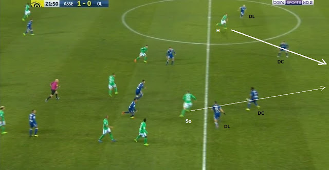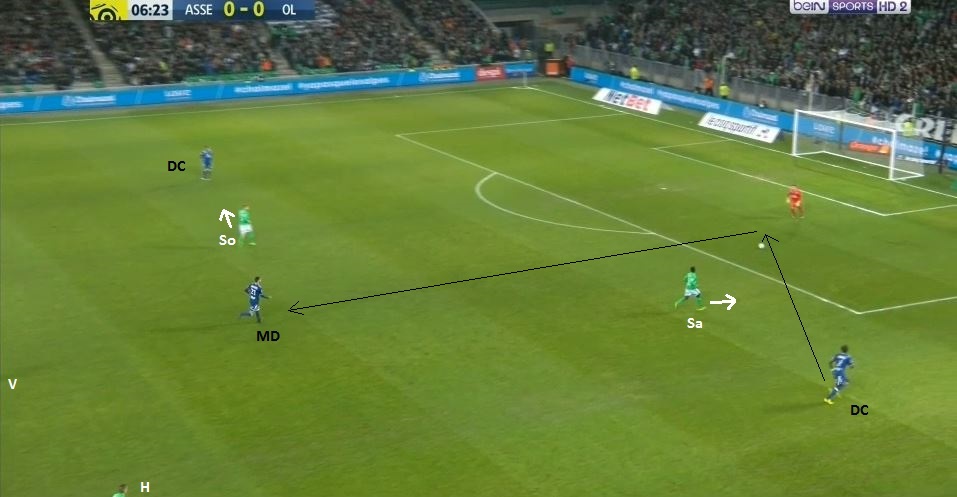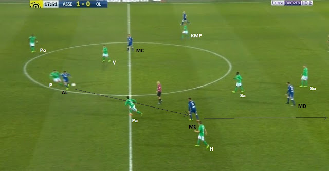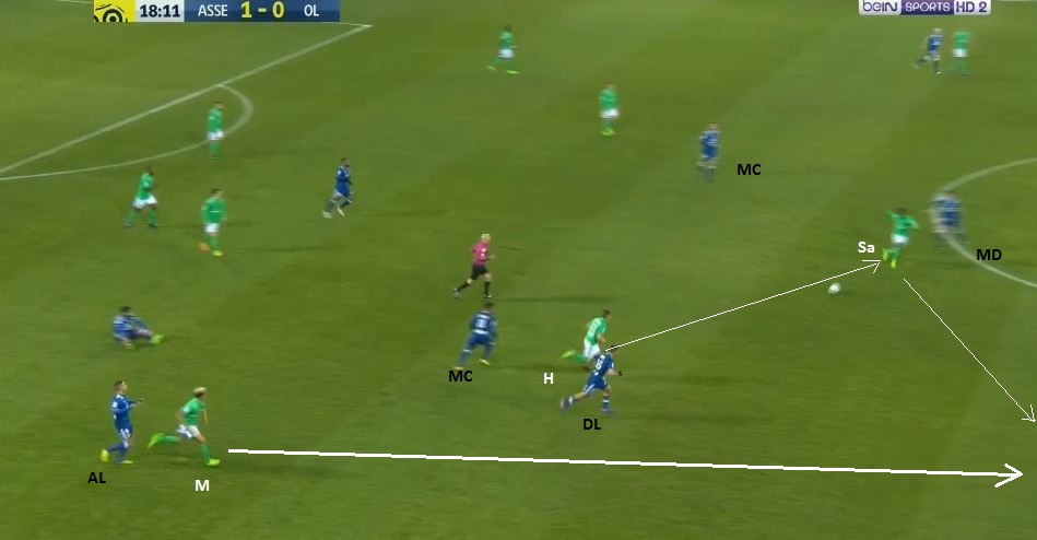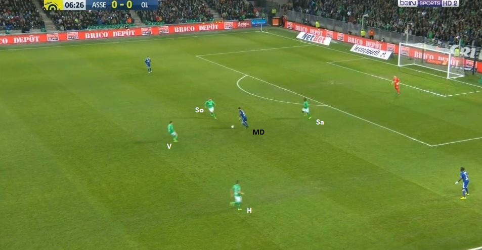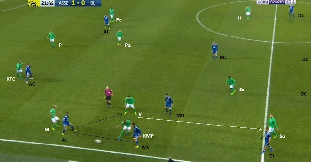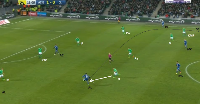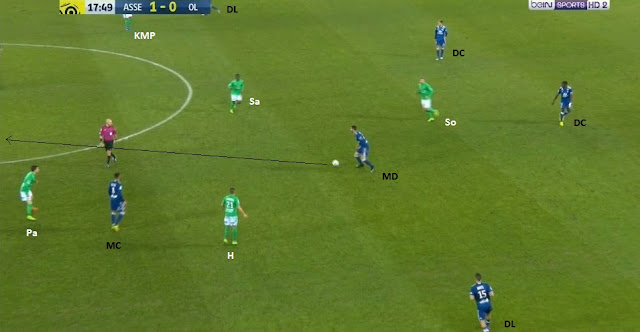 ... à destination du même ailier, toujours placé entre les lignes (nos deux lignes de 4 sont bien visibles). Cette fois-ci la pression défensive ne vient pas de Perrin, mais de Hamouma, qui arrive à lui prendre le ballon...