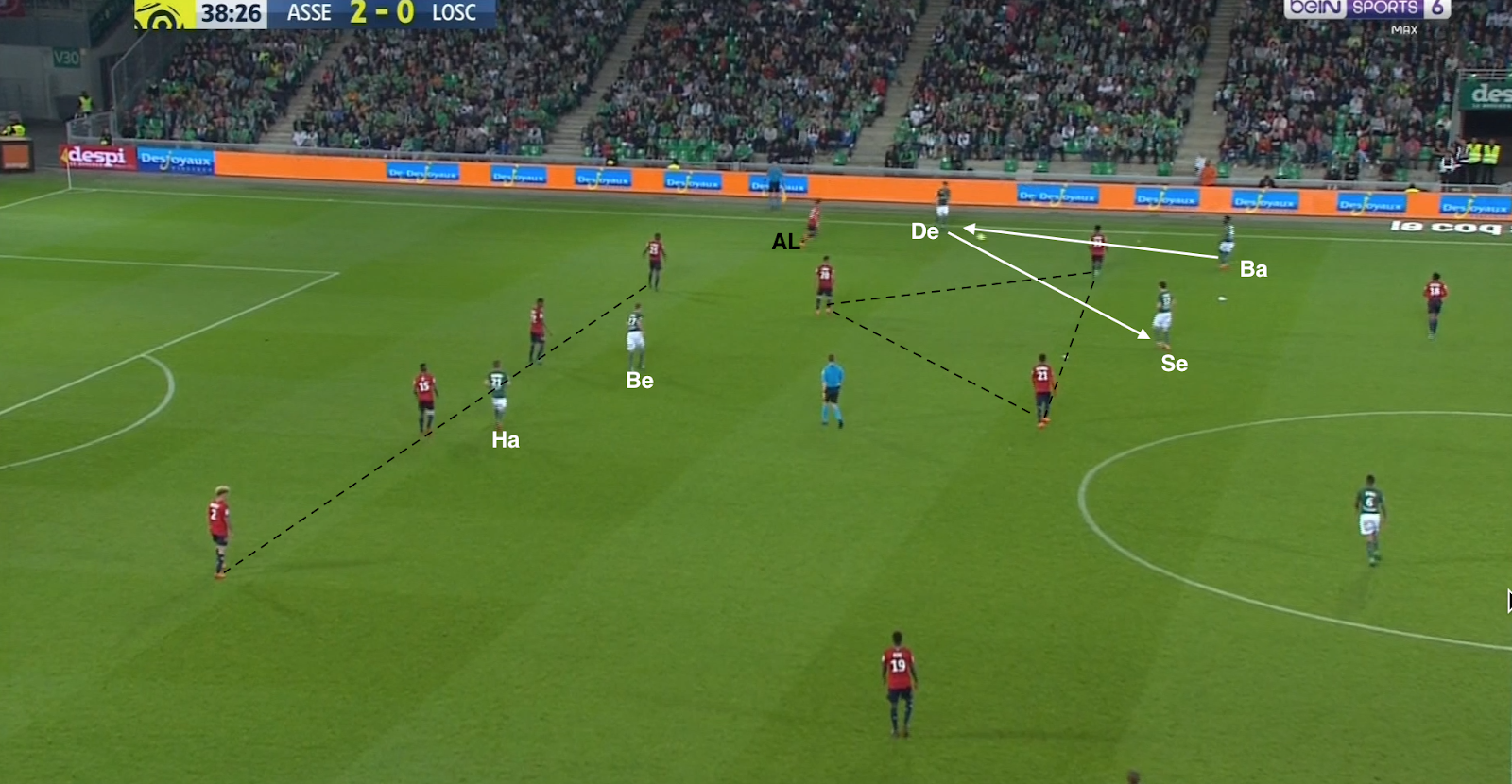 ... qui combine avec Debuchy, et le ballon revient à Selnaes. Il n'y a pas de surnombre sur ce côté du terrain pour les Stéphanois, mais ils combinent sans problème. L'ailier adverse est loin de Debuchy et le triangle des milieux, toujours bien formé, ne coupe aucun angle de passe. On peut même dire que le latéral gauche et la sentinelle adverse ne servent pas à grande chose : la paire latéral-ailier de l'ASSE n'est pas prise par la paire équivalente lilloise et il n'y a pas de joueur Vert entre les lignes non plus. Si le ballon parvient à M'Vila, il est complètement libre, malgré une infériorité numérique théorique au milieu du terrain. Mais il n'y a même pas besoin d'écarter le jeu :