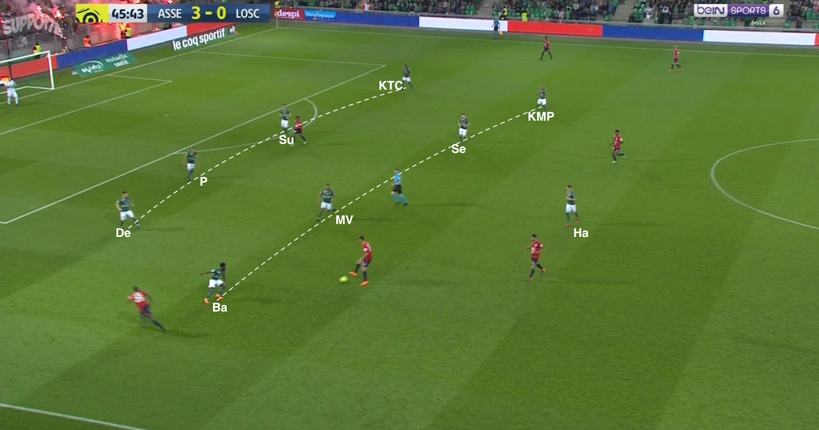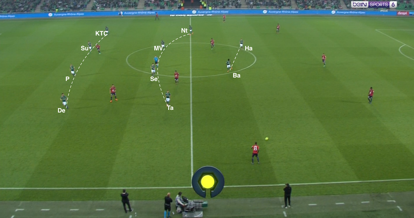 Le plus surprenant dans cette opposition tactique a été de voir la liberté dont Selnaes et M'Vila ont bénéficié au milieu du terrain. Théoriquement ils étaient à 2 contre 3, mais côté Lillois il n'y avait aucune agressivité sur le porteur du ballon. Ainsi, les deux milieux stéphanois ont pu organiser le jeu à leur guise, Selnaes profitant pour faire des remontées balle au pied (comme sur le premier but) ou des belles passes verticales comme sur le deuxième ou le troisième. C'est ce dernier qu'on regardera de plus près, étant le seul marqué suite à une attaque construite contre un bloc défensif en place :
