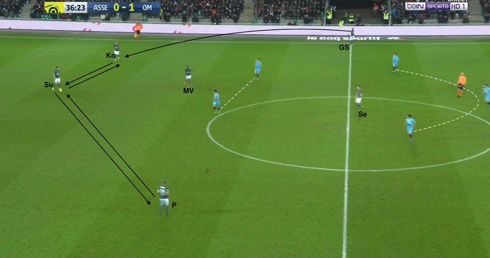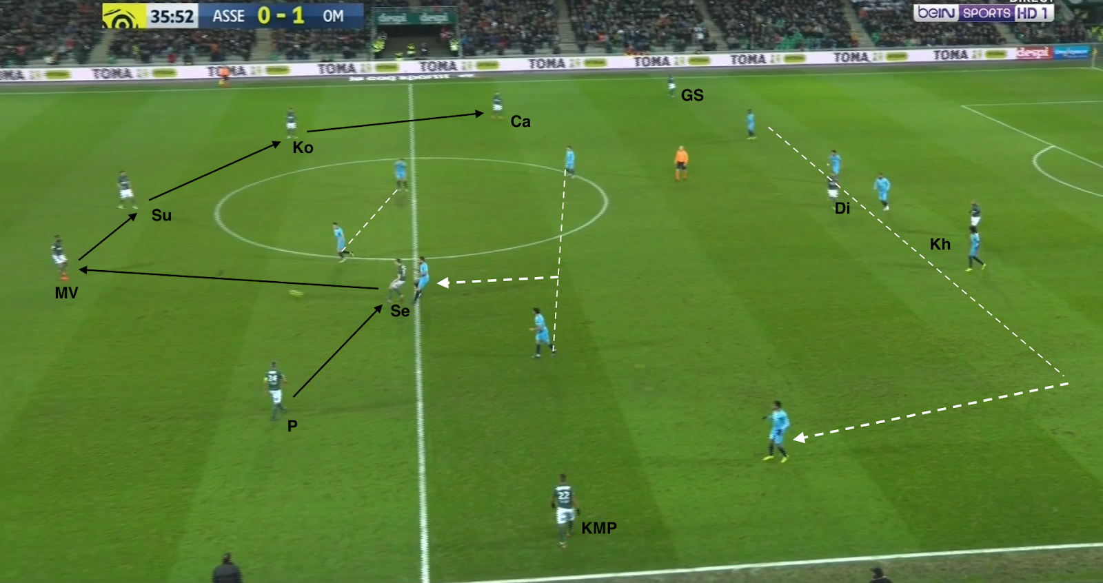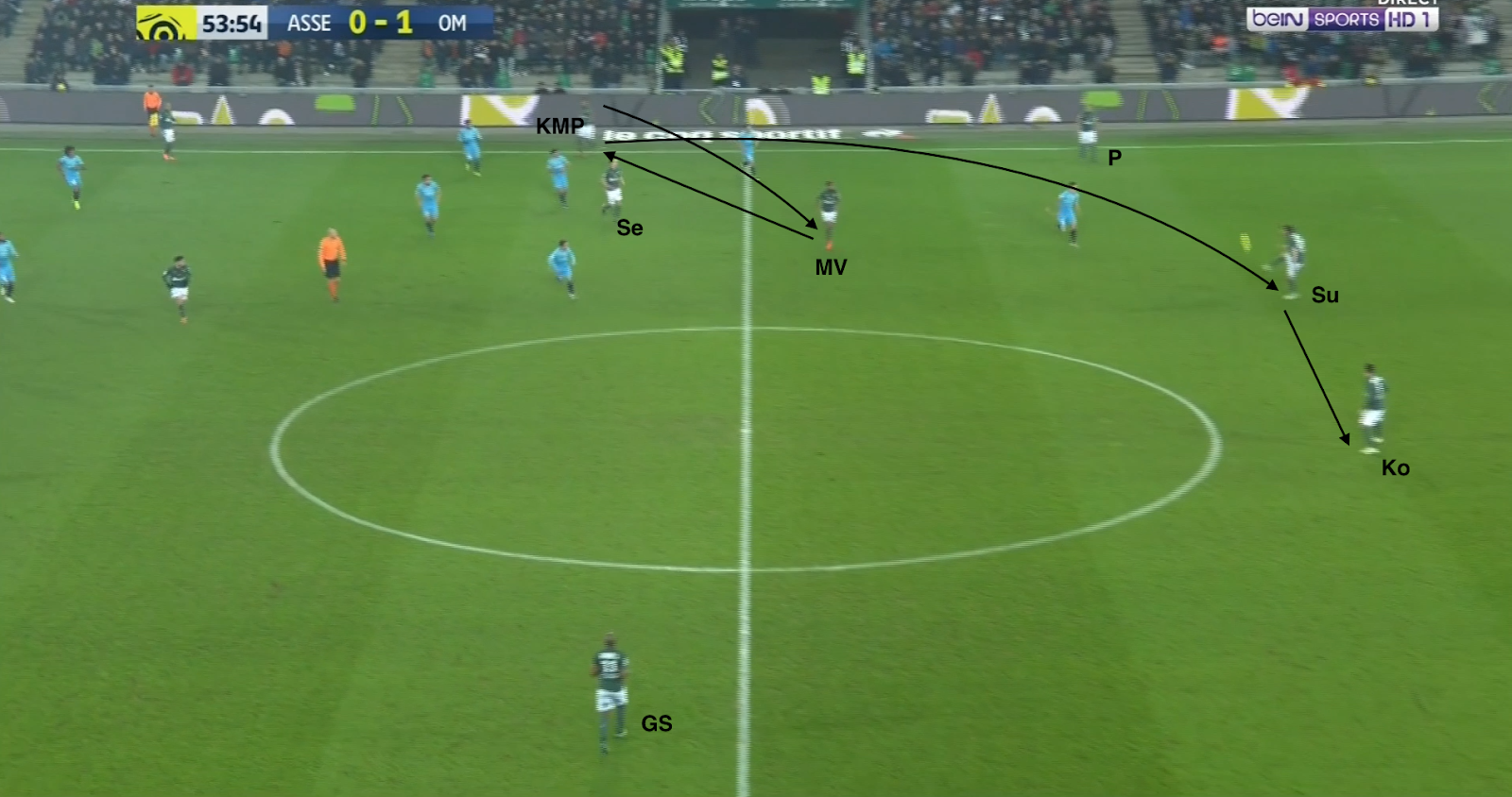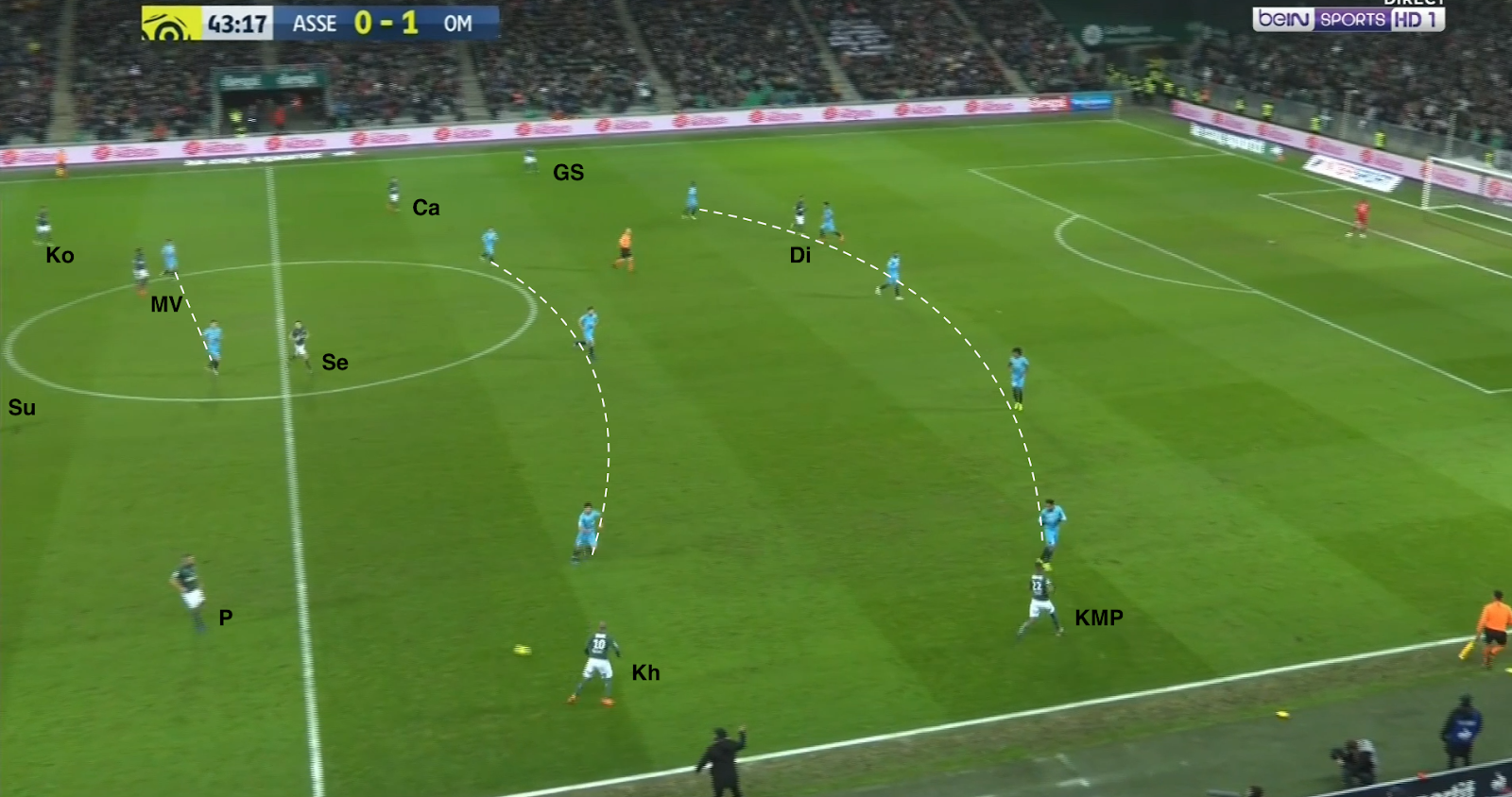 Les deux lignes de 3, respectivement 4, sont bien visibles pour les Verts, tout comme le pressing marseillais qui est déjoué par le sang froid de Selnaes et Perrin. Le premier reçoit le ballon de KMP et se dirige vers l'axe...