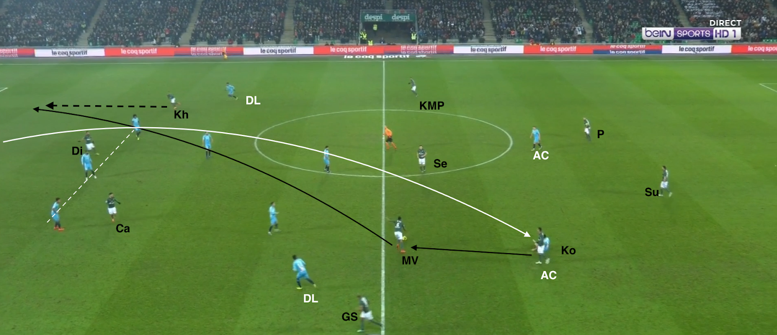 De nouveau, aucun Stéphanois entre les lignes, Khazri et Diony ne décrochent pas et Cabella est excentré à gauche où il reçoit le ballon. Il n'a quasiment aucune solution...