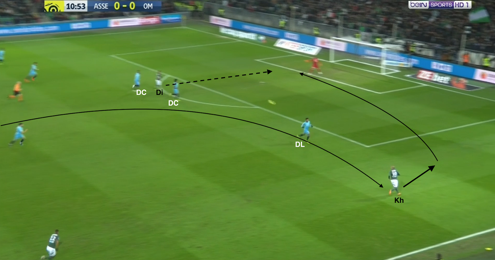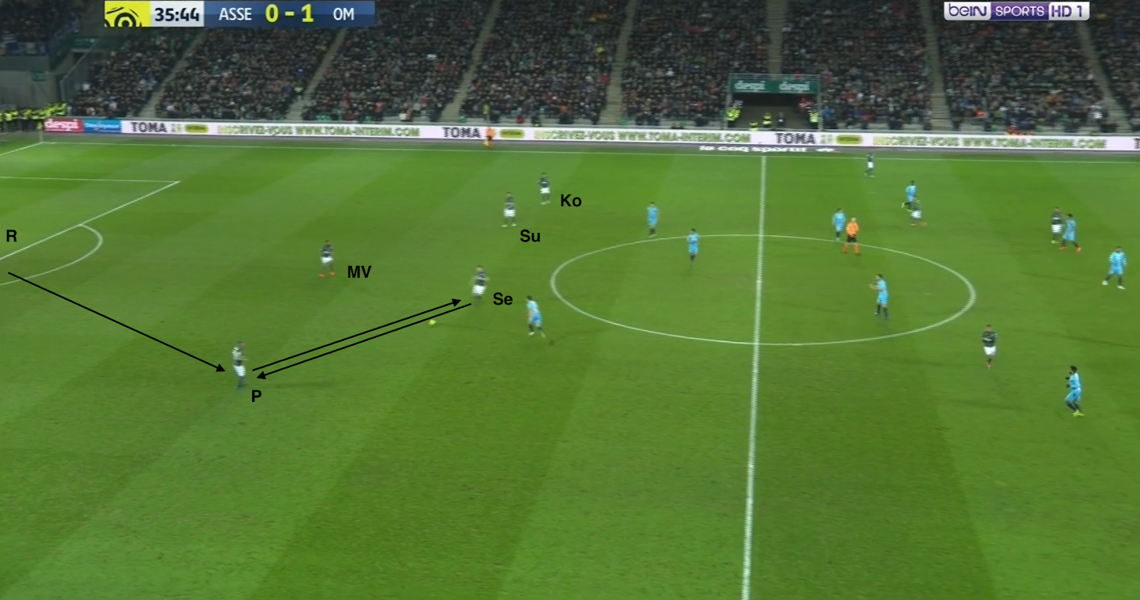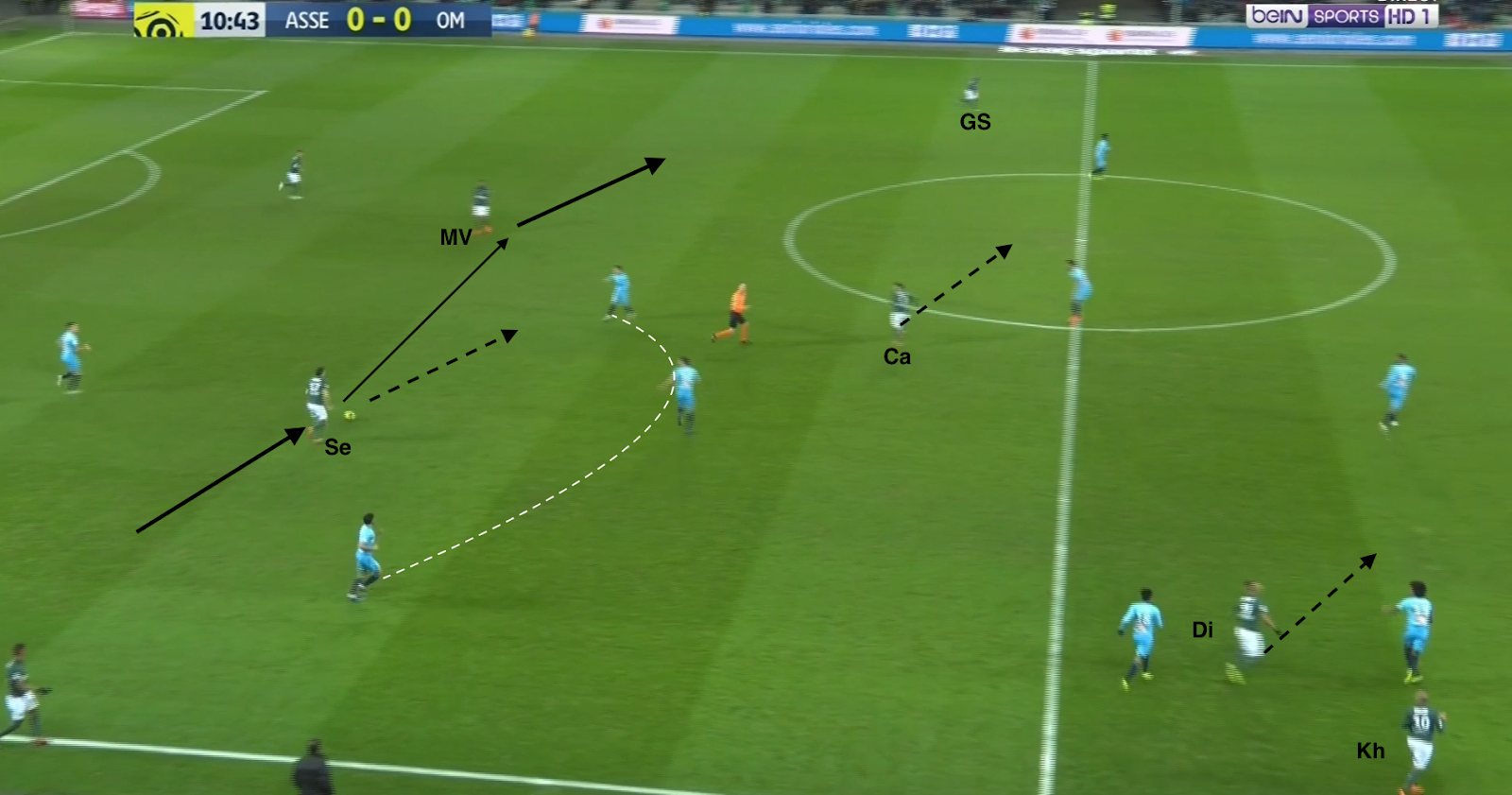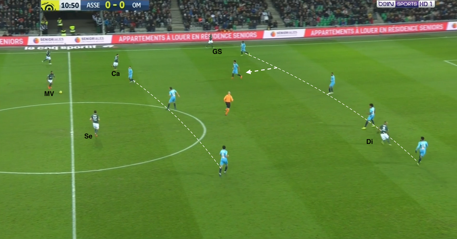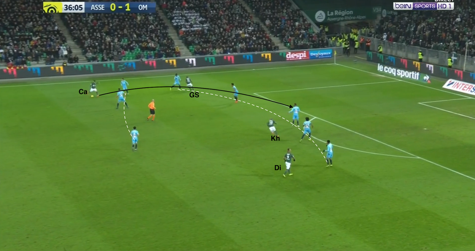 Il est difficile de dire si c'était en réaction à la forte densité marseillaise dans l'axe ou pas, mais les Stéphanois ont souvent évité de se placer entre les lignes adverses. Cabella (dans son rôle de "10") et Khazri (dans son rôle d'avant-centre qui décroche) se sont souvent excentrés, comme parfaitement illustré dans cette capture d'écran :
