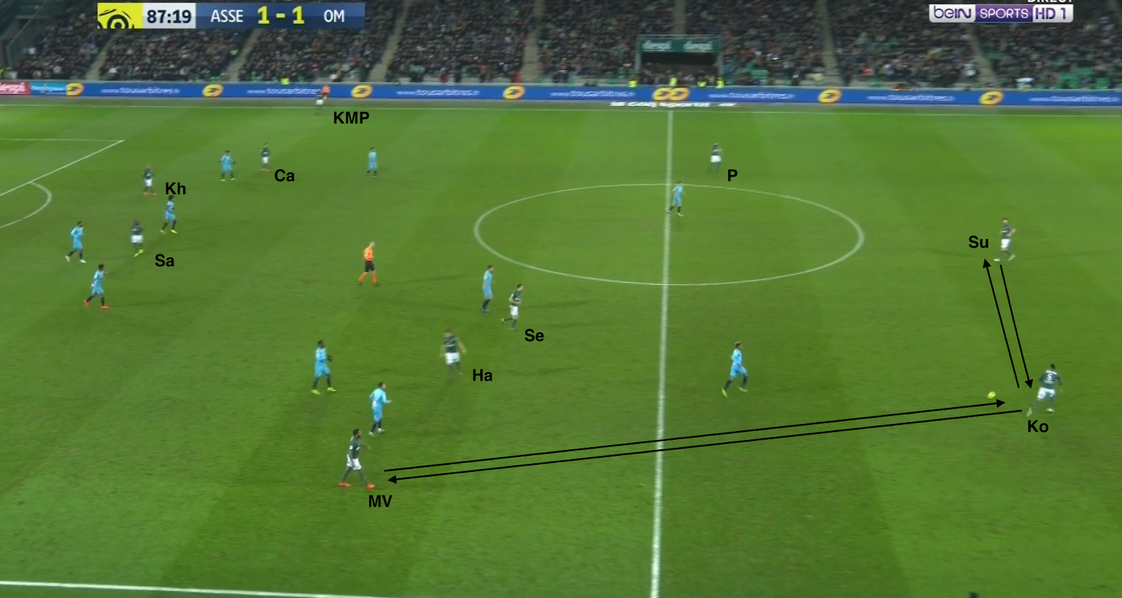Il y a 6 Marseillais dans la moitié de l'ASSE et un d'entre eux récupère le dégagement du défenseur. Avec un nouveau ballon perdu dans leur moitié, les Verts ont du mal à s'en sortir. KMP étant plus haut, un attaquant se place dans son dos :