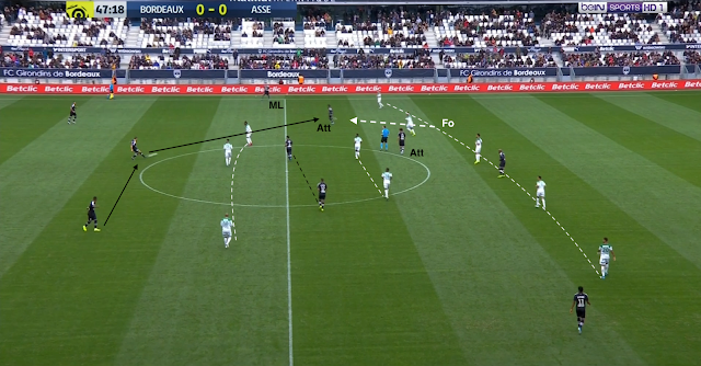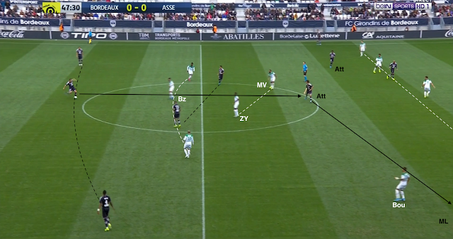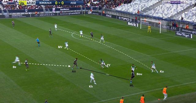 Dans cet exemple à la 37e, le gardien de Bordeaux joue un 6 mètres dans sa surface, avec un défenseur qui lui redonne le ballon. Les trois offensifs des Verts se trouvent dans la surface, les deux milieux sont très hauts aussi, pour serrer les milieux adverses... ce qui signifie qu'ils sont très loin des défenseurs. Et les mêmes deux attaquants s'y trouvent dans cet espace, où un d'entre eux est trouvé par la passe lobée du gardien. Bouanga trop haut, décalage fait vers le piston dans son couloir...