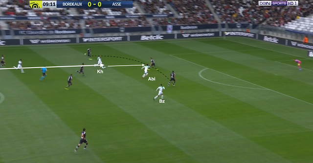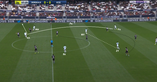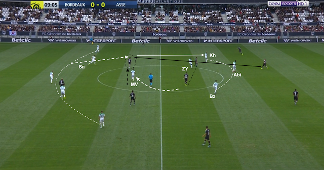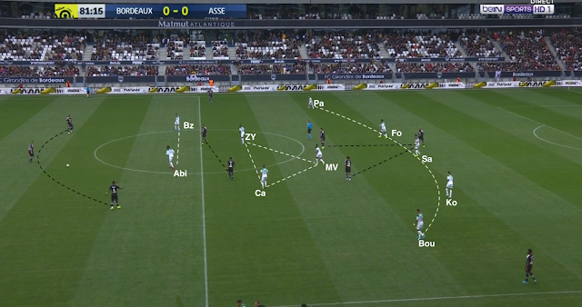 Un 5-2-3 avec Palencia et Bouanga en pistons, Perrin entouré de Saliba et Fofana en défense centrale, M'Vila et Youssouf au milieu et une ligne de trois offensifs Khazri-Abi-Boudebouz. Du côté de Bordeaux, un système similaire, 3-4-3 (ou 5-2-3) - sur cette image on voit un des trois offensifs décrocher au niveau des milieux. Et comme contre Lyon, les Stéphanois ont bien resserré les lignes des milieux et attaquants pour empêcher les adversaires de trouver leurs milieux. Leur défense centrale combine, essaie de déplacer le jeu vers la gauche...