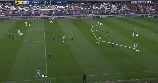 Ruffier relance avec Saliba, qui joue plus haut avec Youssouf : le (3-)4-3 des Girondins est visible, tout comme le 3-4-1-(2) des Verts, Boudebouz ayant décroché pour offrir une solution. Il est trouvé par Youssouf et joue en arrière avec Saliba, qui décale à gauche avec Kolo :