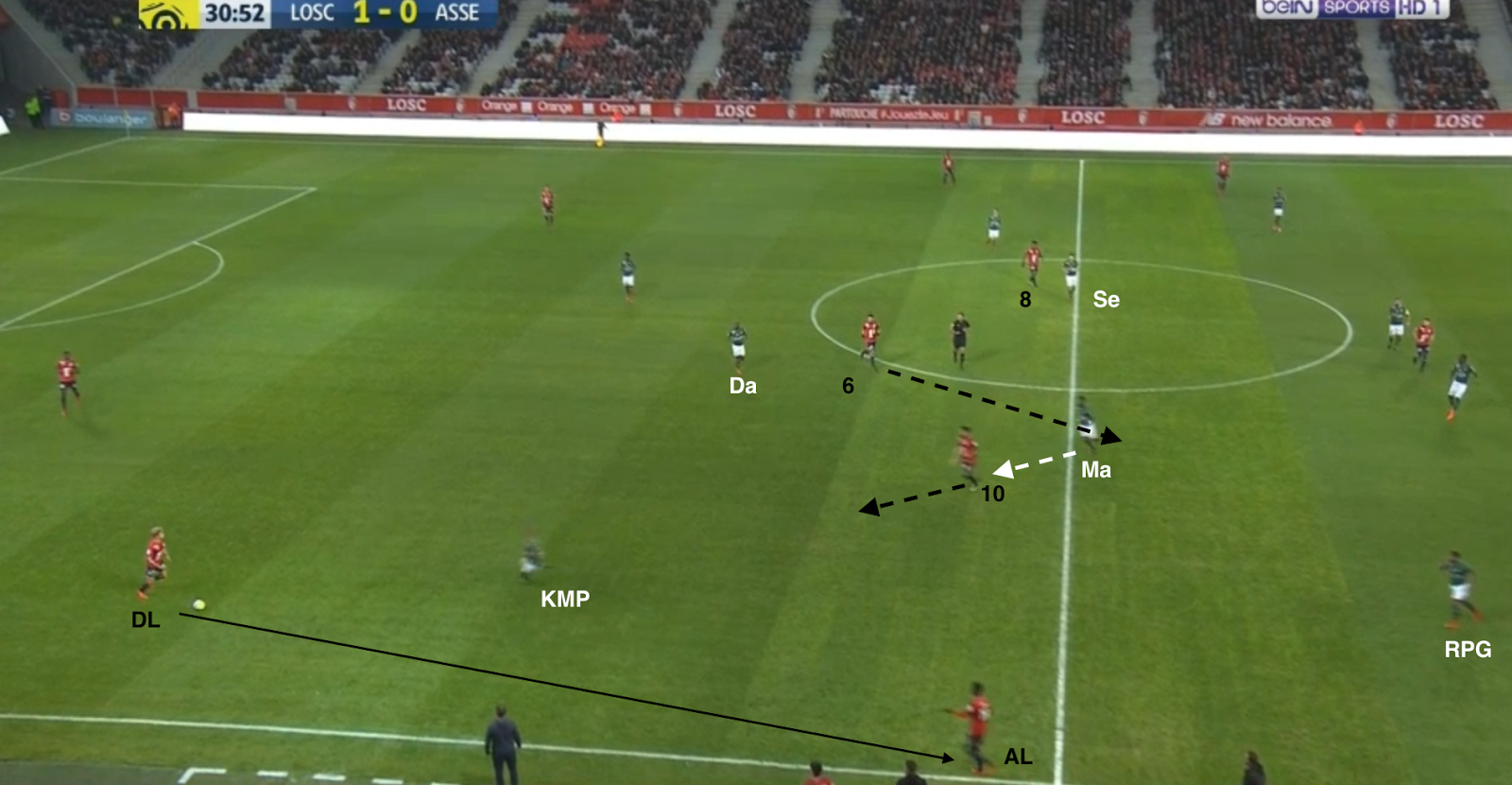 Ce 4-4-1-1 des Verts a du sens quand on regarde Lille jouer. Même si théoriquement ils jouent en 4-2-3-1, le triangle au milieu est plutôt pointe basse quand ils ont le ballon (ce qui arrive très souvent, Lille ayant la meilleure possession de L1 après le PSG). La sentinelle (le "6") est l'organisateur du jeu et il y a 4 joueurs (les deux ailiers, le "8" et le "10") qui sont prêts à recevoir le ballon. Le choix stéphanois a donc été de faire un marquage individuel sur le 6 - le rôle de Dabo - et de mettre une ligne de 4 milieux, une ligne très serrée, même les deux excentrés Pajot et KMP étant plus dans l'axe que sur le côté.