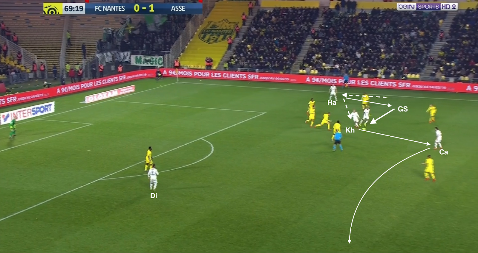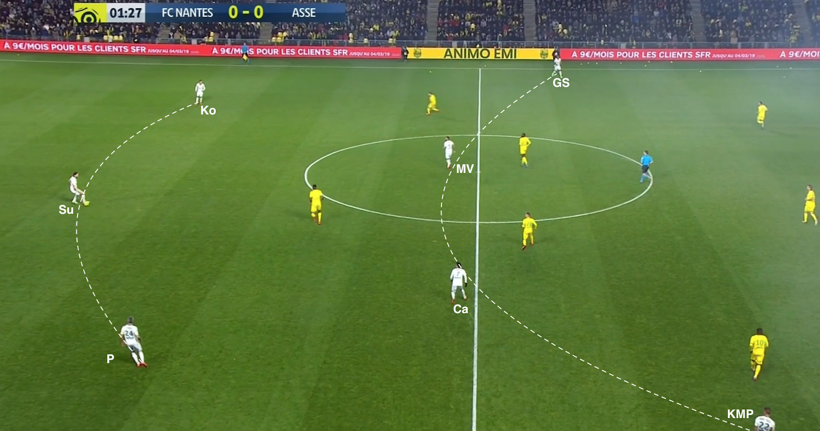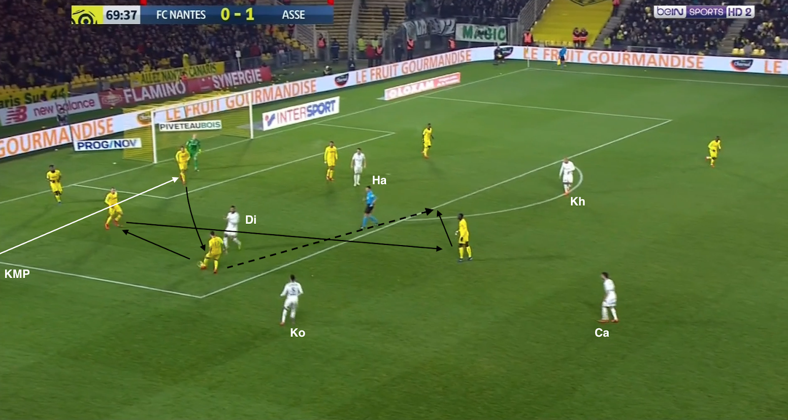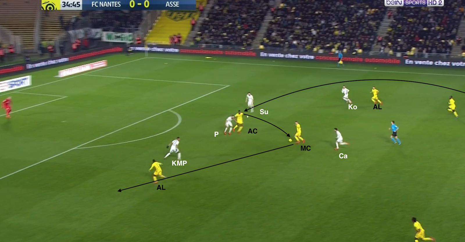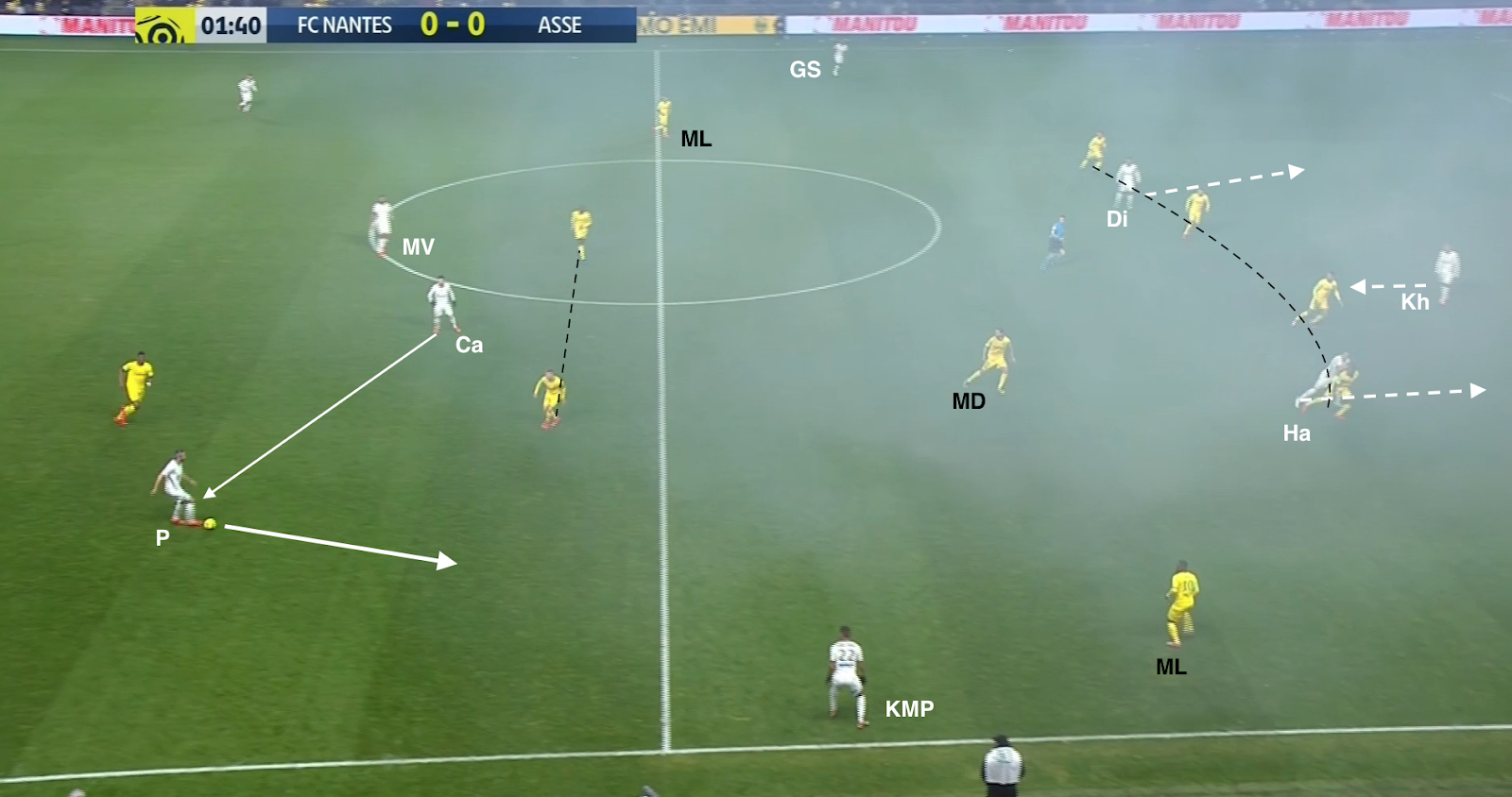 Mais ça n'a pas toujours suffit et les Nantais ont pu profiter de certaines erreurs de placement dans le bloc stéphanois. Par exemple à la 35e :