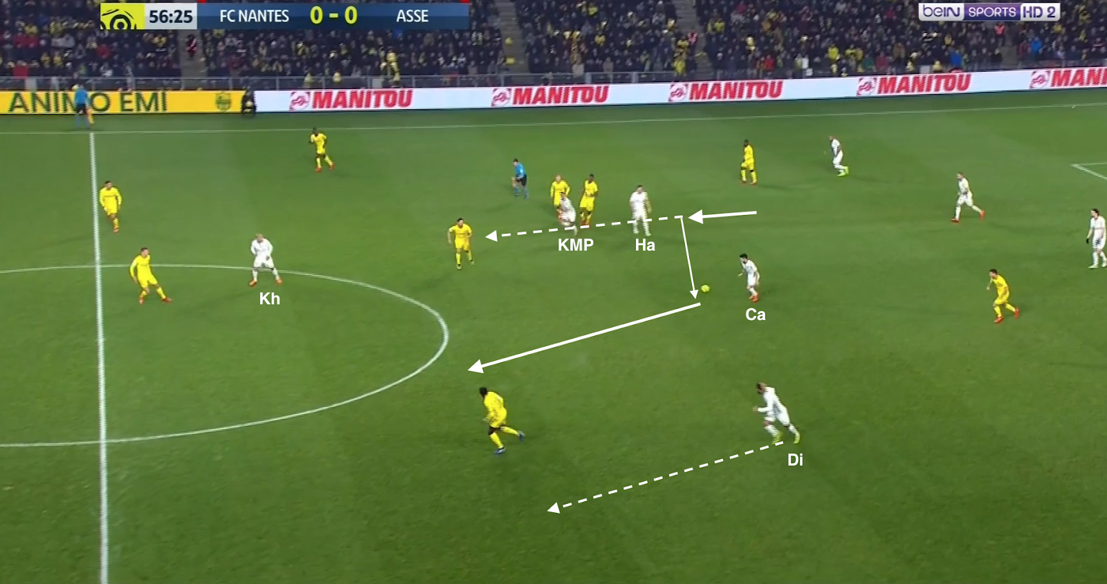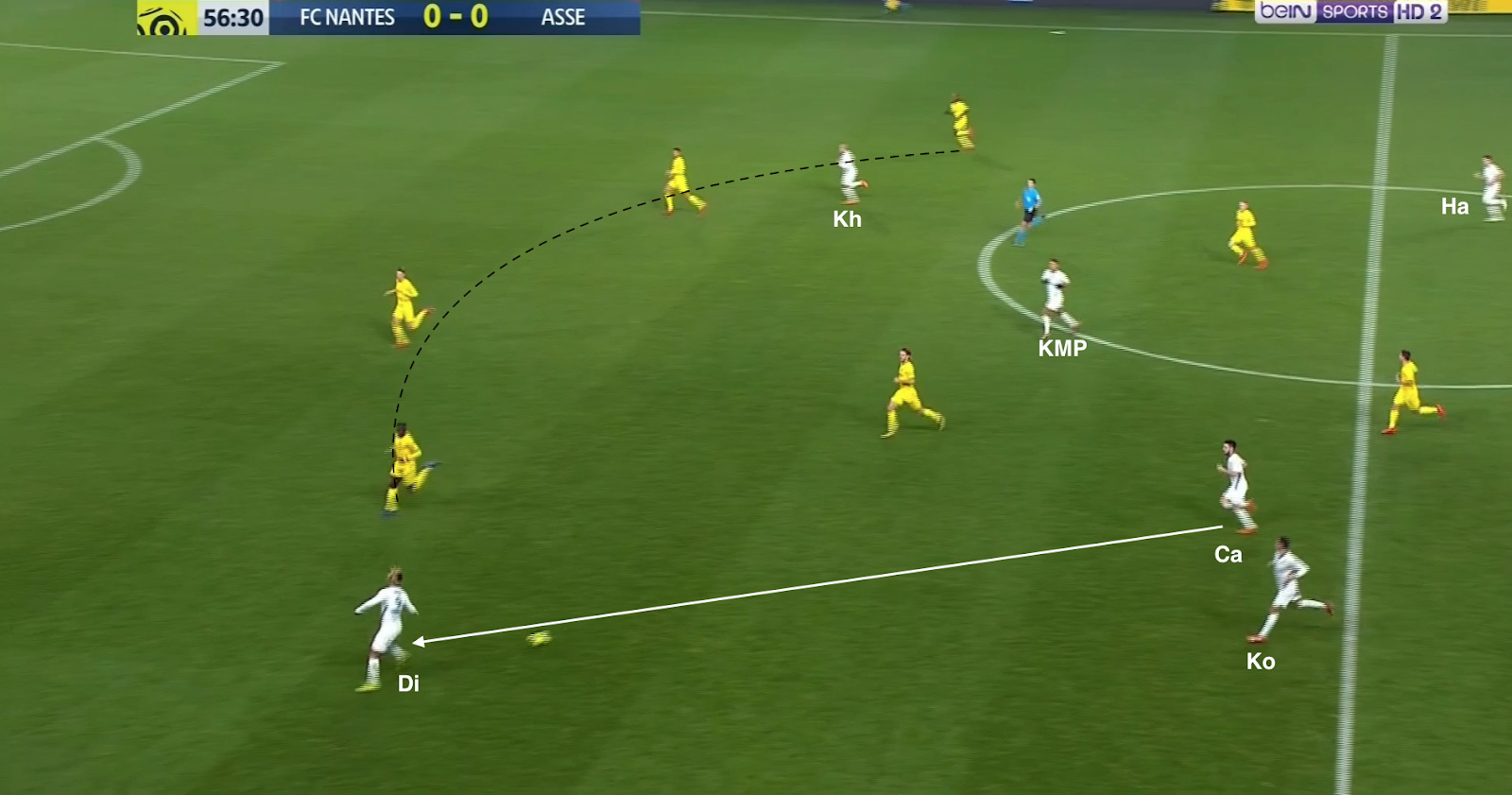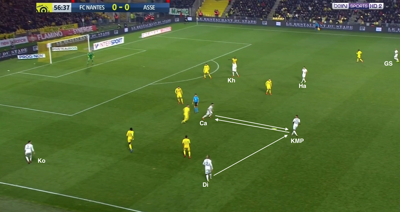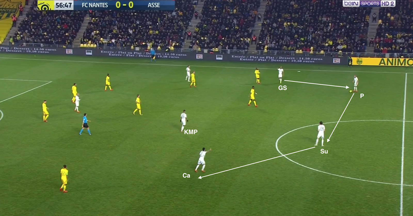 Le ballon est dans les pieds d'un défenseur adverse, Hamouma coupe l'angle de passe vers le latéral droit, Diony surveille le gauche, la défense gère les trois attaquants et M'Vila, Cabella et Khazri proposent un triangle pointe haute qui colle aux milieux axiaux nantais. Sauf que Cabella quitte sa zone pour monter sur le défenseur central (un pressing d'attaquant), oubliant le milieu dans son dos, qui reçoit le ballon et qui lance en première intention le latéral dans son couloir. Hamouma n'avait pas suivi, mais KMP si, arrivant à repousser le ballon en touche. La remise en jeu et quelques passes envoient le ballon sur le côté opposé :