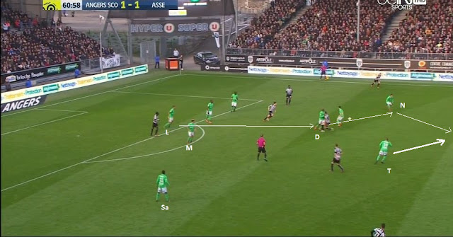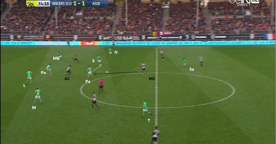 On compte en ce moment 5 Angevins pour 6 Stéphanois, dont Saivet bien démarqué et Malcuit qui arrive dans son dos. Il est évident comment il faut jouer la suite :