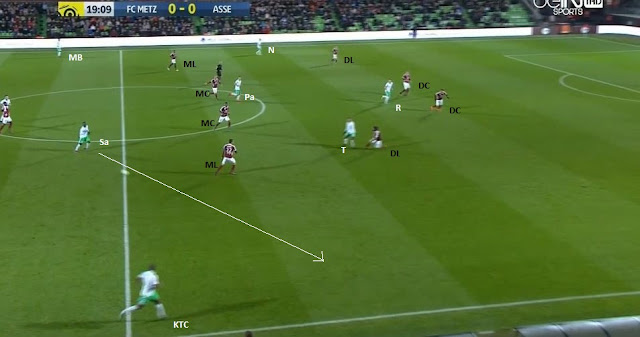 Sur la capture suivante, on voit bien les deux lignes de 4 de Metz, ainsi que l'appel classique de Tannane, de son côté vers l'axe, qui aspire parfaitement le latéral (BAE) et qui libère ainsi le couloir pour KTC :