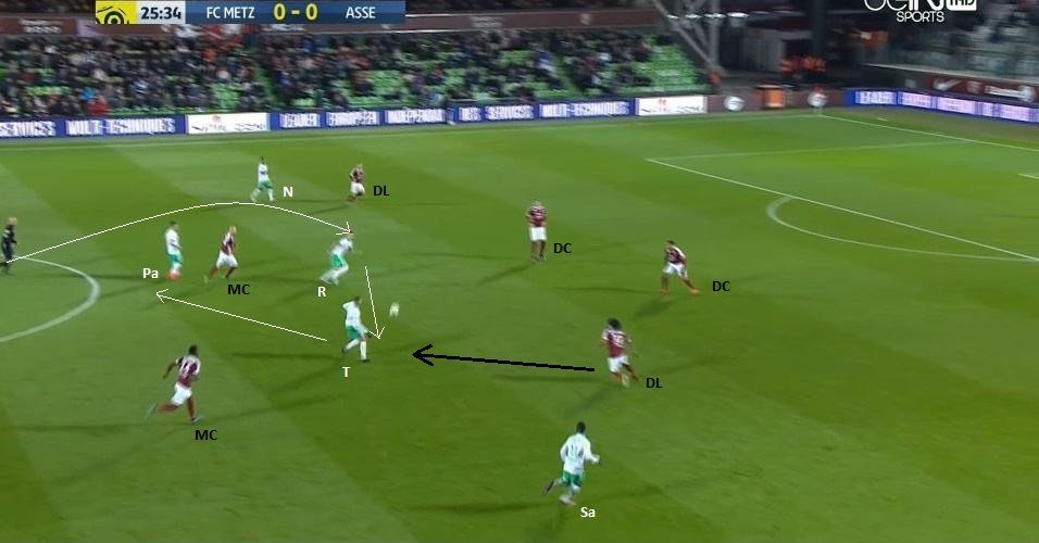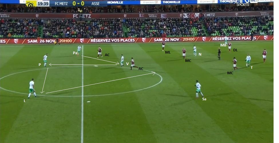 On remarque de nouveau le positionnement en "10" de Tannane, ainsi que le grand espace autour de Saivet. Cependant, le ballon ne lui parvient pas, Pajot joue avec Veretout, en retrait pour Perrin, Lacroix, de nouveau Veretout, le premier rideau messin est de nouveau dépassé :