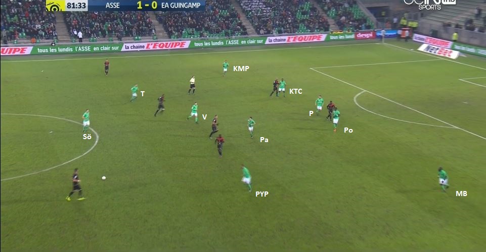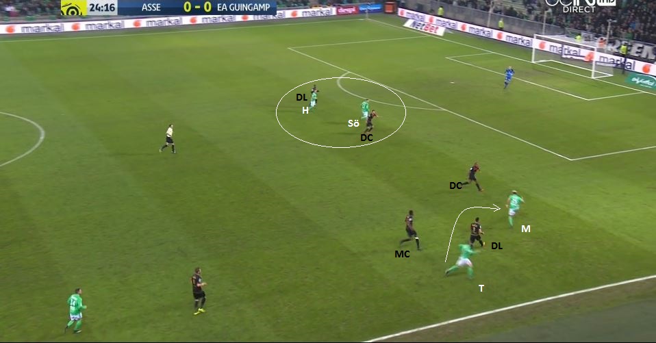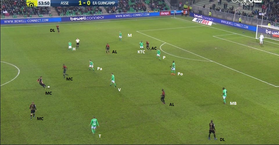 Le un-deux entre Malcuit et Tannane fonctionne parfaitement et à eux deux ils ont pris 4 adversaires : deux défenseurs éliminés pas la passe de Tannane, l'ailier qui suit Malcuit et la sentinelle qui doit couvrir :