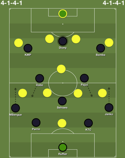 Pour le 4e match après le départ de Garcia, le nouveau staff technique des Verts a utilisé un 4e système technique différent. Après un 4-4-1-1 avec Dabo en soutien de l'avant-centre, après un 4-2-3-1 avec Hernani en meneur de jeu et après un pari de solidité raté dans un 5-3-2, l'ASSE a joué contre Nantes dans un 4-1-4-1 assez classique :