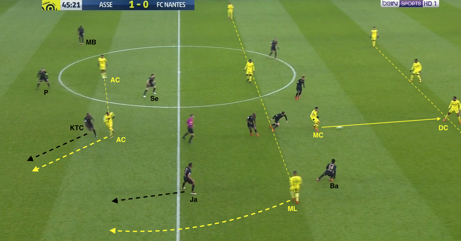 La sentinelle adverse est toujours au marquage de l'arbitre entre les lignes, aucun autre joueur ne s'y trouve. Le positionnement haut des milieux adverses ne leur sert à rien, on a décidé de passer au-dessus. Et le positionnement intelligent de MBengue et Janko, à mi-distance entre les deux lignes adverses (mais excentrés, pas dans la zone de la sentinelle) leur permet de recevoir le ballon et le contrôler avant d'être pris par un adversaire. Dans ce cas, MBengue a le temps de faire un amorti de la poitrine, se retourner et chercher par une passe Diony, qui dévie en première intention dans la course de KMP, qui avait fait un appel dans le dos du latéral monté chercher le latéral Stéphanois.