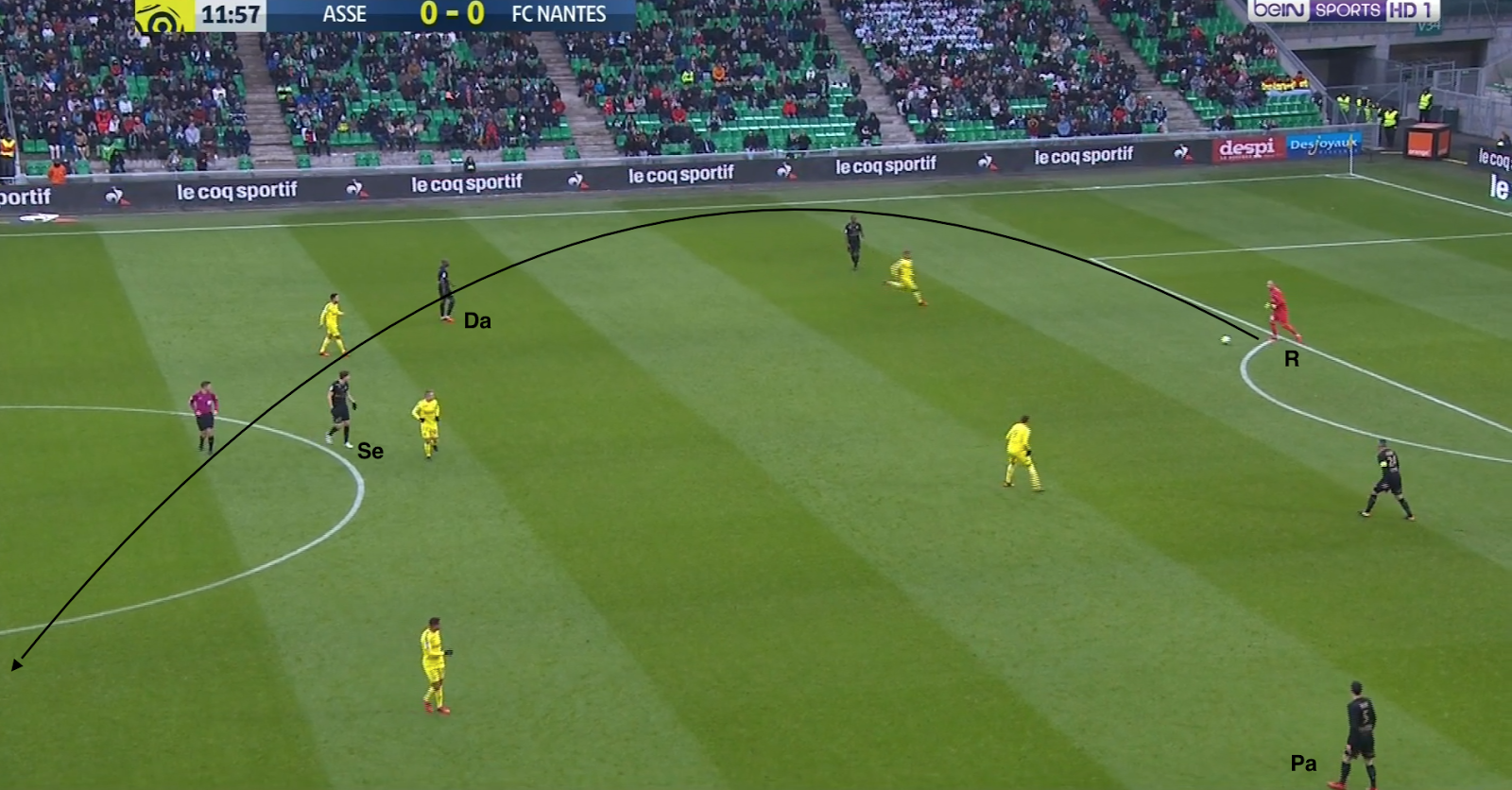 L'ASSE a eu la possession du ballon en début du match, jusqu'à l'ouverture du score, 56%, et a abusé des passes longues qui sautaient le milieu nantais, plus que dans ses autres matchs cette saison. Mais pour mieux comprendre comment les Verts ont utilisé le ballon quand ils l'avaient, prenons un exemple à la 12e :