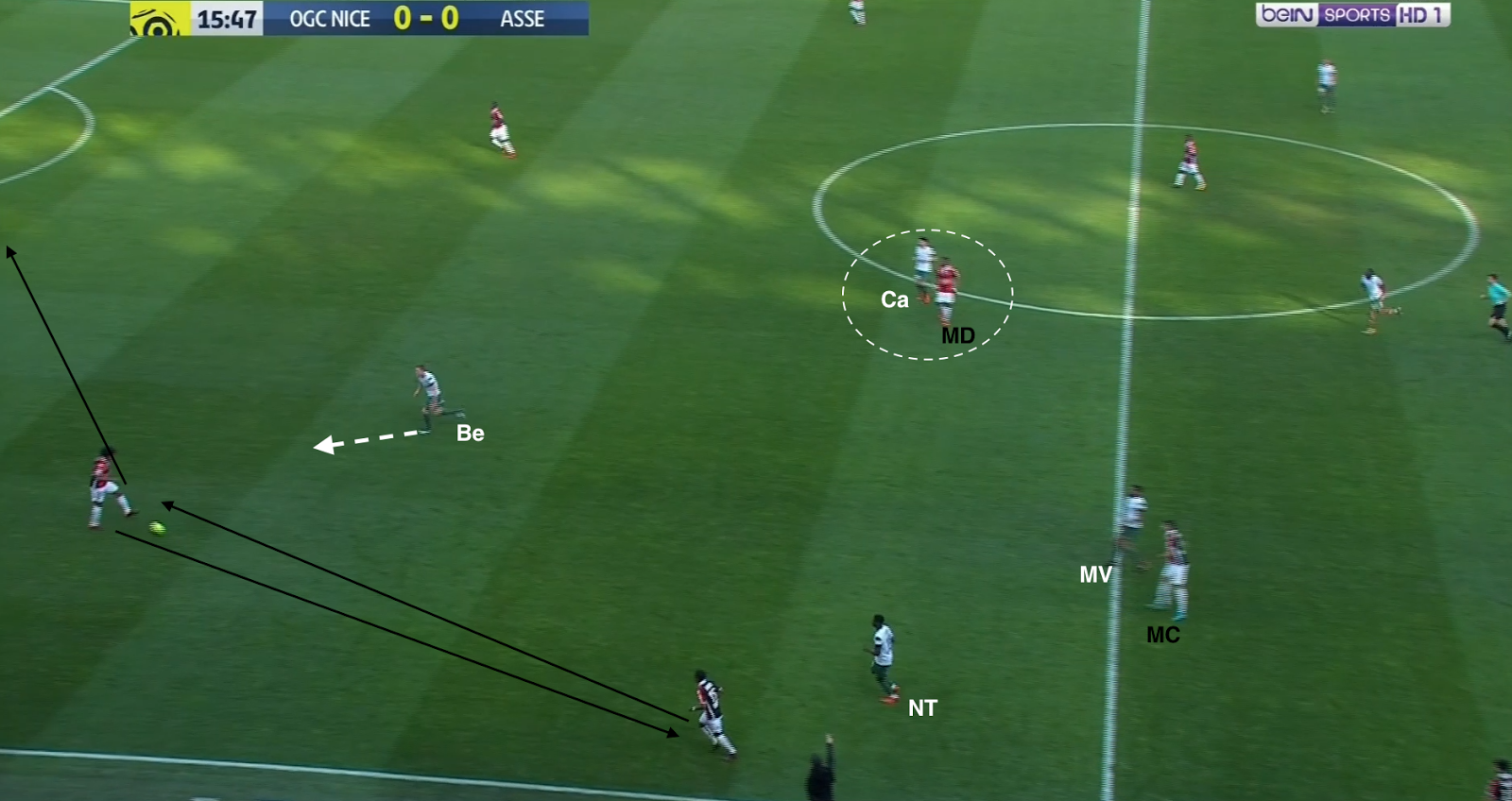 Les défenseurs niçois combinent et cherchent le milieu défensif. La ligne de 4 milieux stéphanois est en place, Beric et Cabella n'en font pas partie, ils pressent le milieu qui envoie en catastrophe vers son gardien. La relance se fait avec un défenseur central...