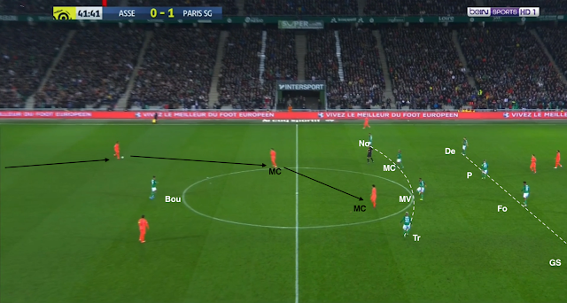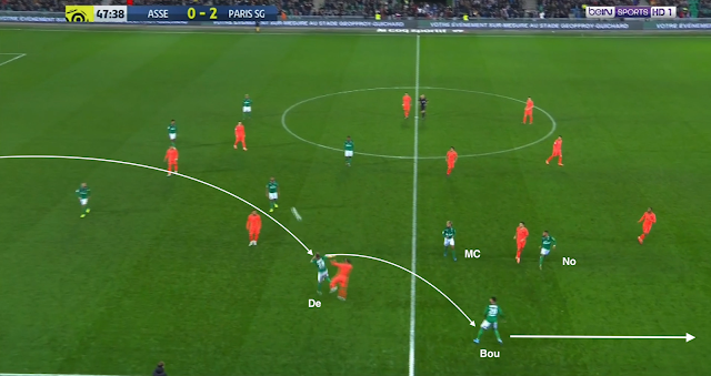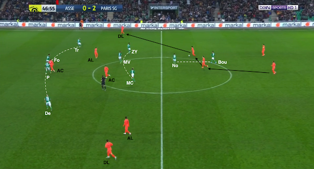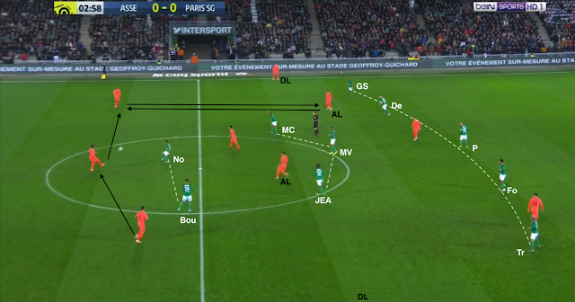 Le 4-4-2 parisien a rendu la vie dure au milieu stéphanois, parce que les couloirs étaient pris par des latéraux, les deux avant-centres monopolisaient la défense et les deux ailiers se plaçaient dans l'axe, créant ainsi un surnombre dans cette zone du terrain. Le plan des Verts était d'empêcher la construction adverse et procéder par des contres, comme dans cet exemple à la 3e minute, où la défense adverse garde le ballon, s'appuie sur un ailier (axial), avant de changer de côté, vers la droite :