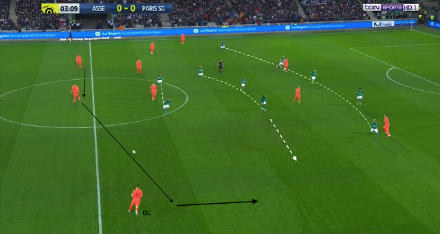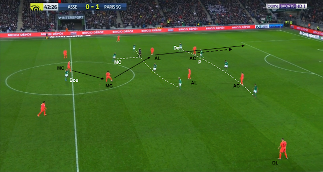 Un Parisien se place dans ce trou, les angles de passes sont faciles à trouver, l'ailier est trouvé entre les lignes et l'avant-centre est lancé en profondeur, pour le 2-0.