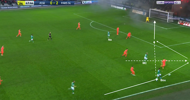 Il lance immédiatement Bouanga, et comme Nordin part en contre aussi, les Verts se retrouvent à 2-contre-2 avec les centraux parisiens. Leurs courses ne sont pas bien coordonnées (pour essayer d'écarter la défense)...