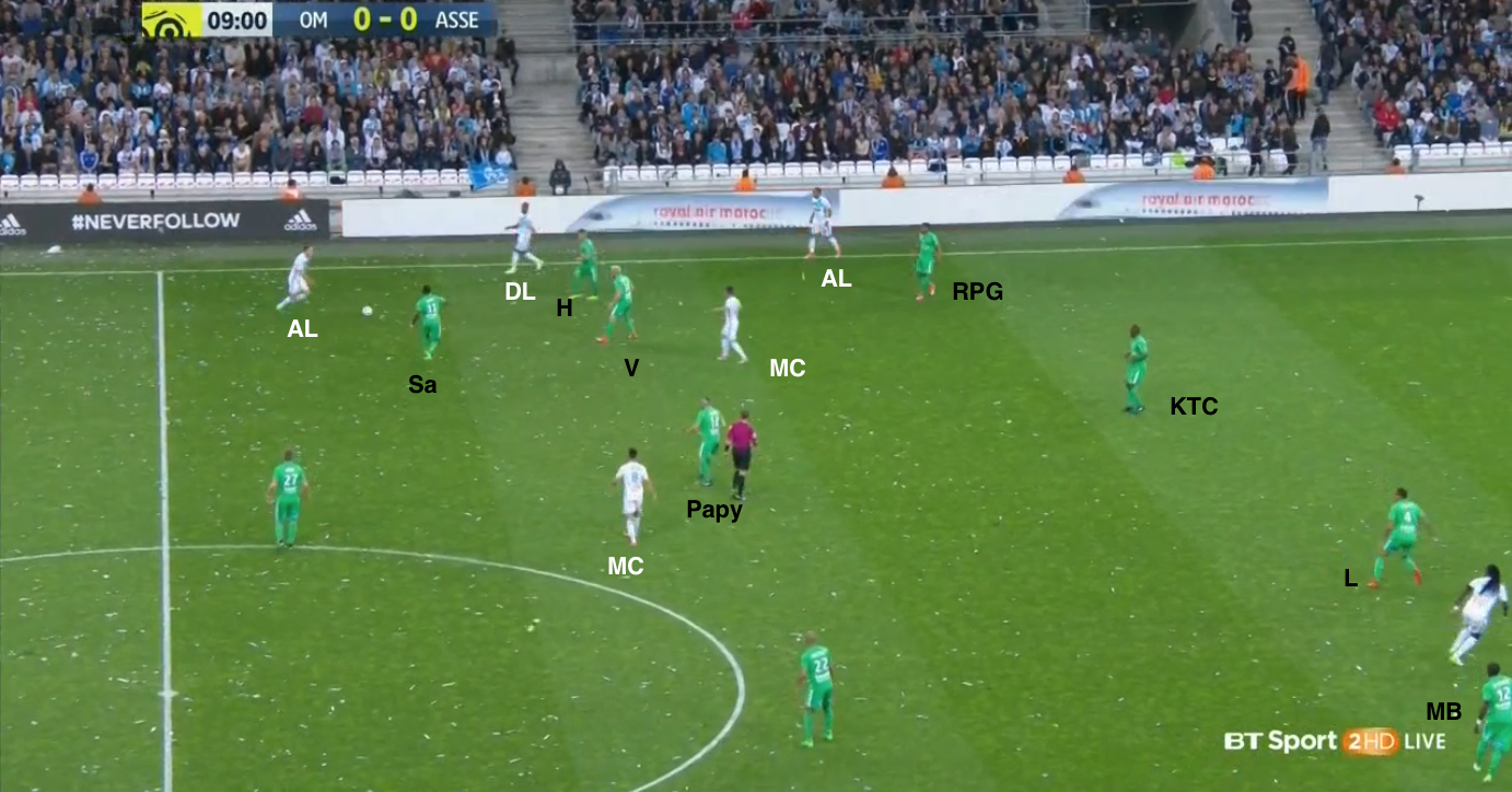 Avec toujours la même configuration. Les 5 joueurs marseillais bougent beaucoup et se font des passes dans ce petit périmètre. Ça ne passe pas à chaque fois, mais assez souvent - d'ailleurs le premier but a été marqué exactement grâce à ce petit jeu. Dans le cadre de cet exemple, le décalage est fait, mais il n'y a pas de but :