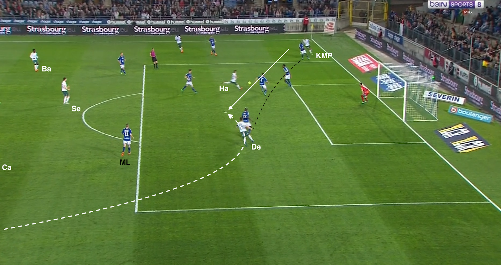 KMP arrive lancé dans son couloir, Hamouma est seul dans l'axe de la défense, pendant que Debuchy est surveillé par le milieu latéral adverse sur le côté opposé. Et pourtant, quand le centre en retrait part...