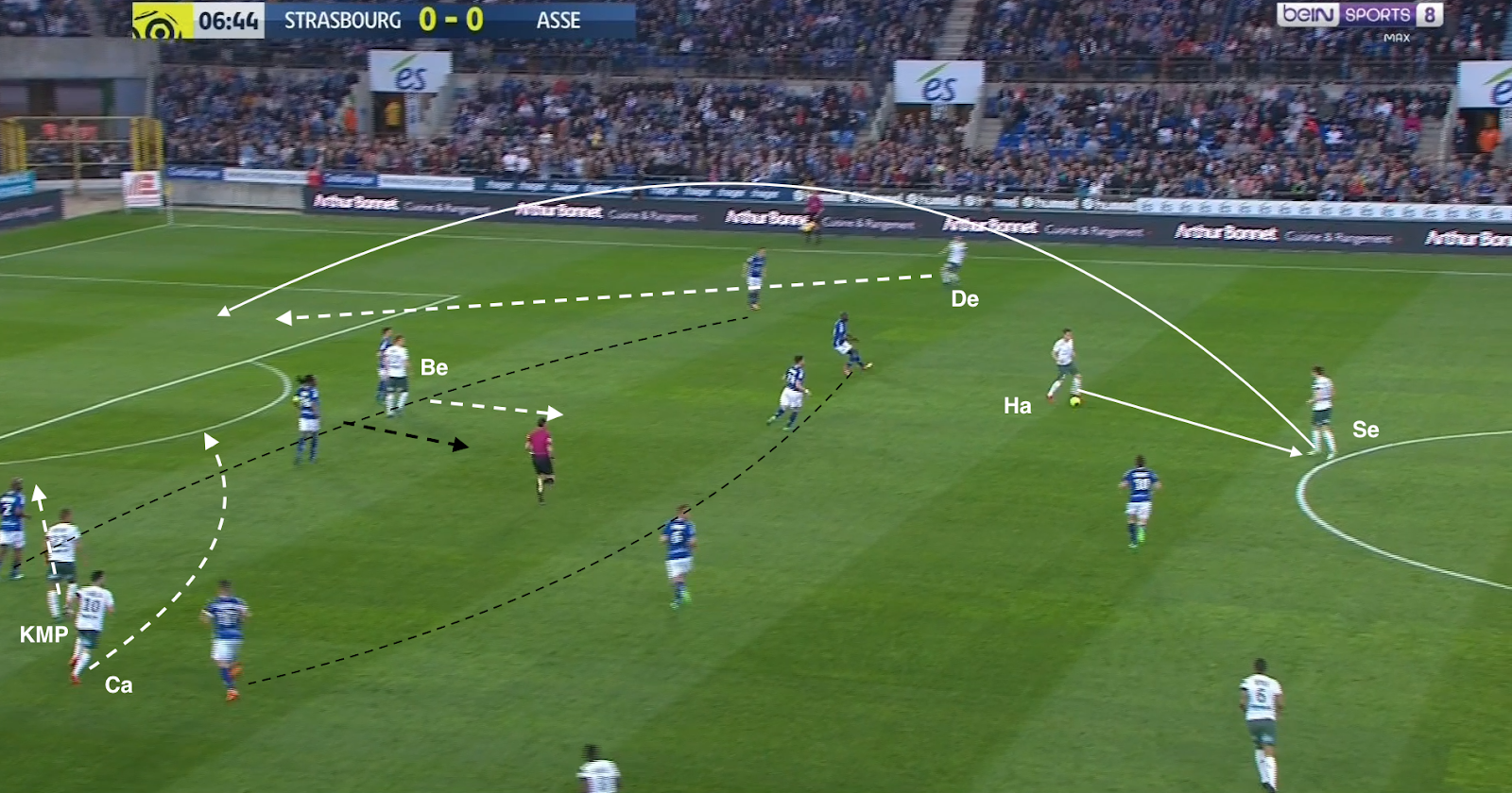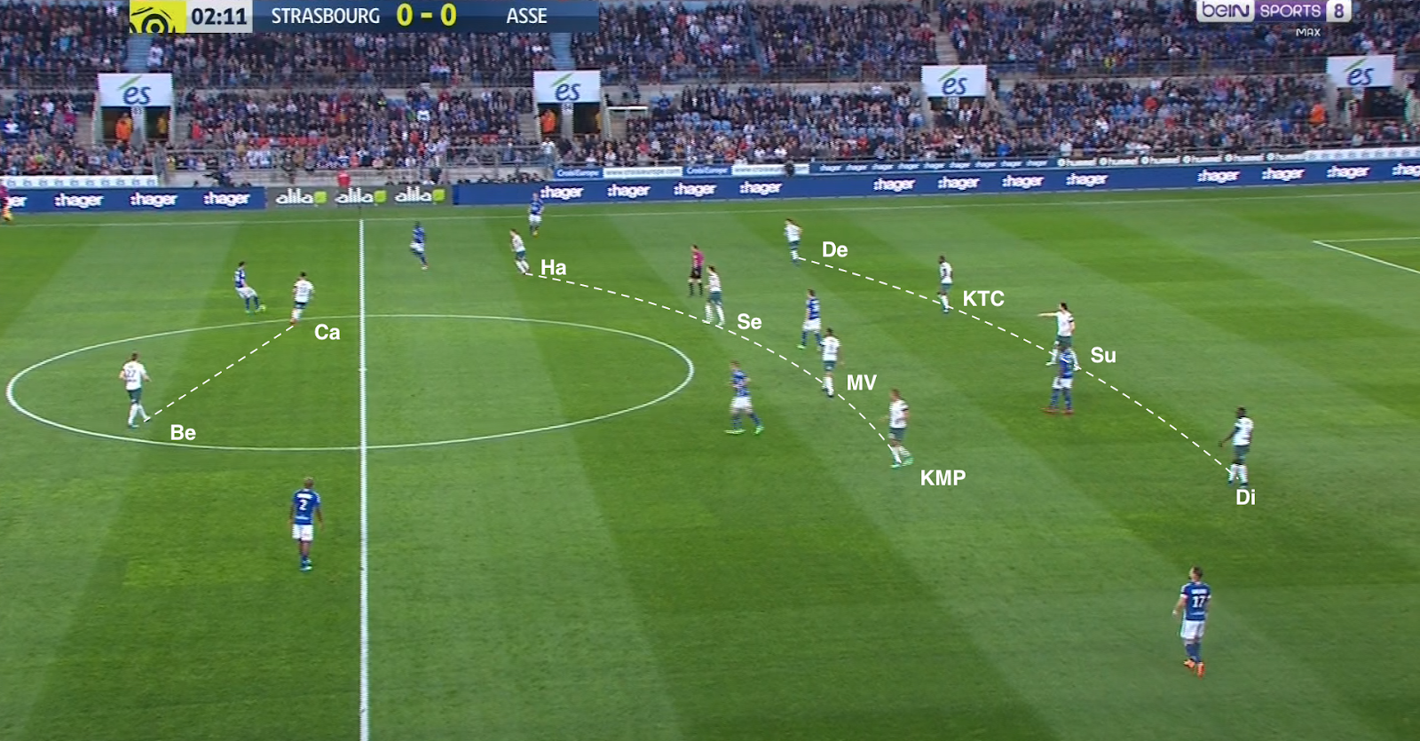 ... et les Stéphanois font tourner le ballon dans la défense, tranquilles - Strasbourg n'effectuant pas de pressing haut à ce moment du match. KTC, Subotic, M'Vila... le ballon est envoyé au latéral gauche KMP :