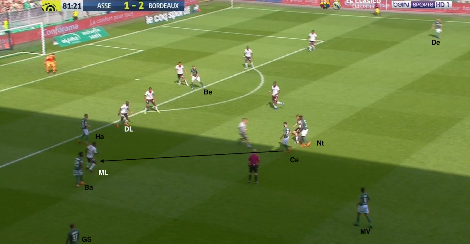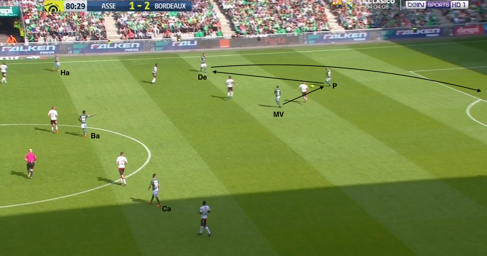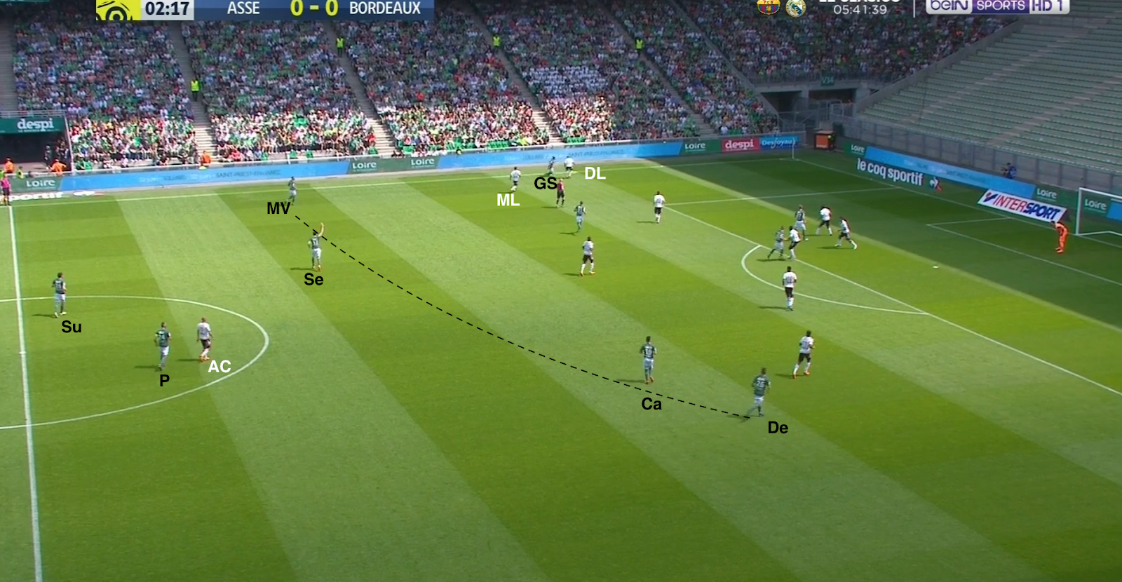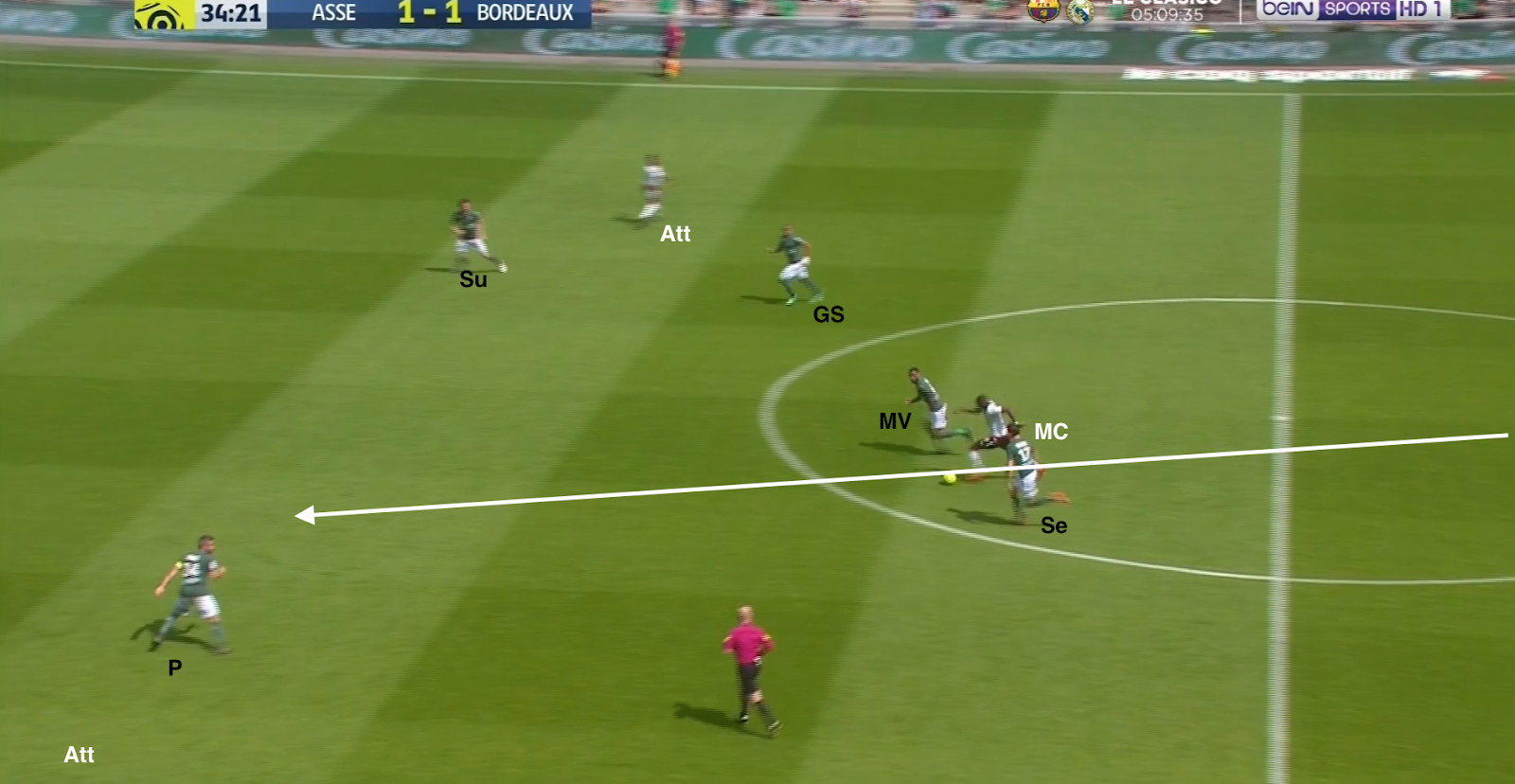 Perrin se trouve dans une position de meneur de jeu (et Cabella de défenseur central). L'adversaire qui se trouve à terre n'a pas d'influence sur cette action, il y a trois stéphanois autour de lui (M'Vila, Cabella et Subotic). Il y a des 2-contre-2 dans chaque couloir, Beric est entouré de 3 adversaires... il n'y a aucun décalage fait, sauf que l'appel de Bamba est parfaitement effectué dans l'espace libéré par le latéral adverse, tout comme la passe du capitaine, qui le trouve à l'entrée de la surface. Malheureusement sa frappe trouve le poteau...