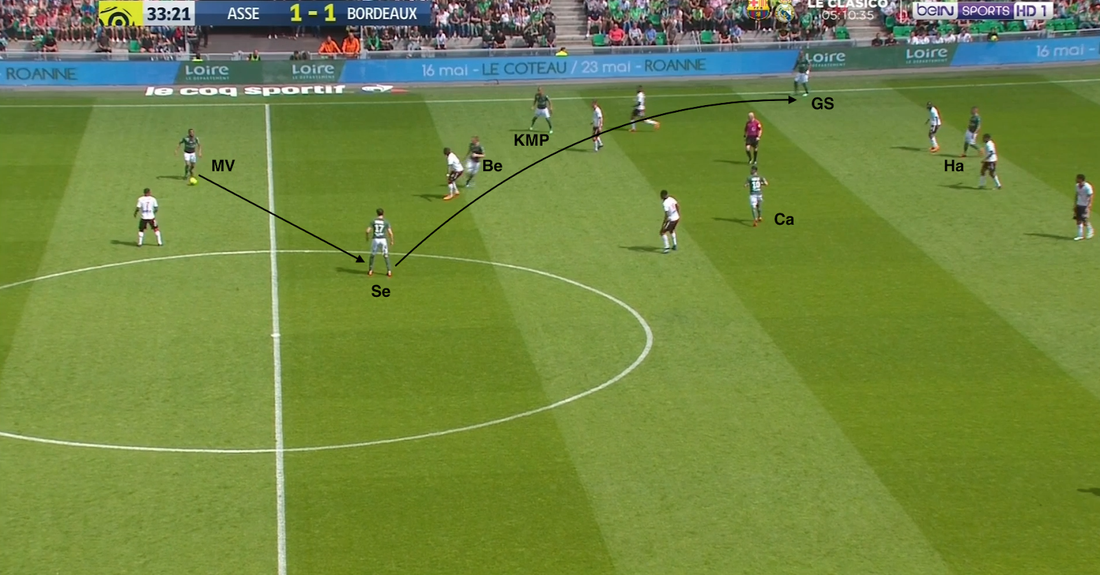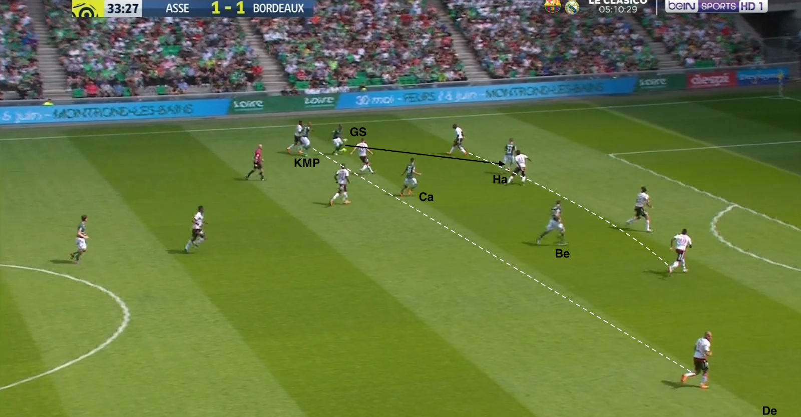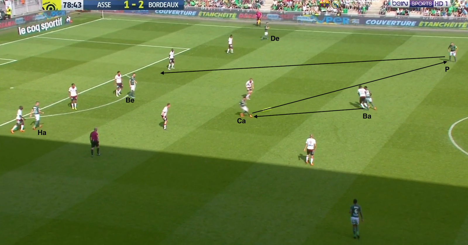 Perrin se trouve dans une position de meneur de jeu (et Cabella de défenseur central). L'adversaire qui se trouve à terre n'a pas d'influence sur cette action, il y a trois stéphanois autour de lui (M'Vila, Cabella et Subotic). Il y a des 2-contre-2 dans chaque couloir, Beric est entouré de 3 adversaires... il n'y a aucun décalage fait, sauf que l'appel de Bamba est parfaitement effectué dans l'espace libéré par le latéral adverse, tout comme la passe du capitaine, qui le trouve à l'entrée de la surface. Malheureusement sa frappe trouve le poteau...