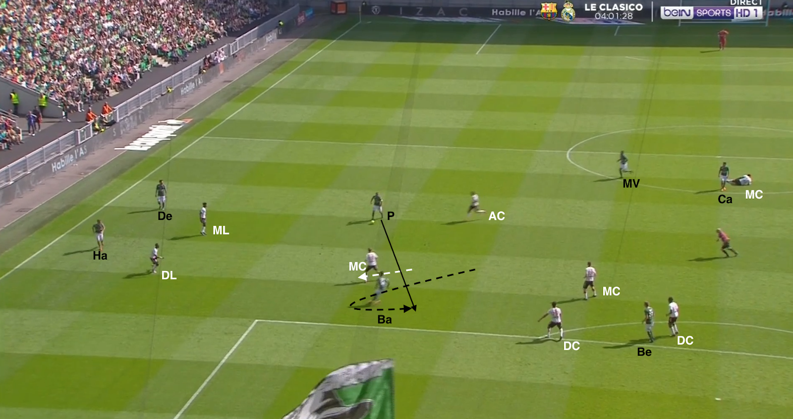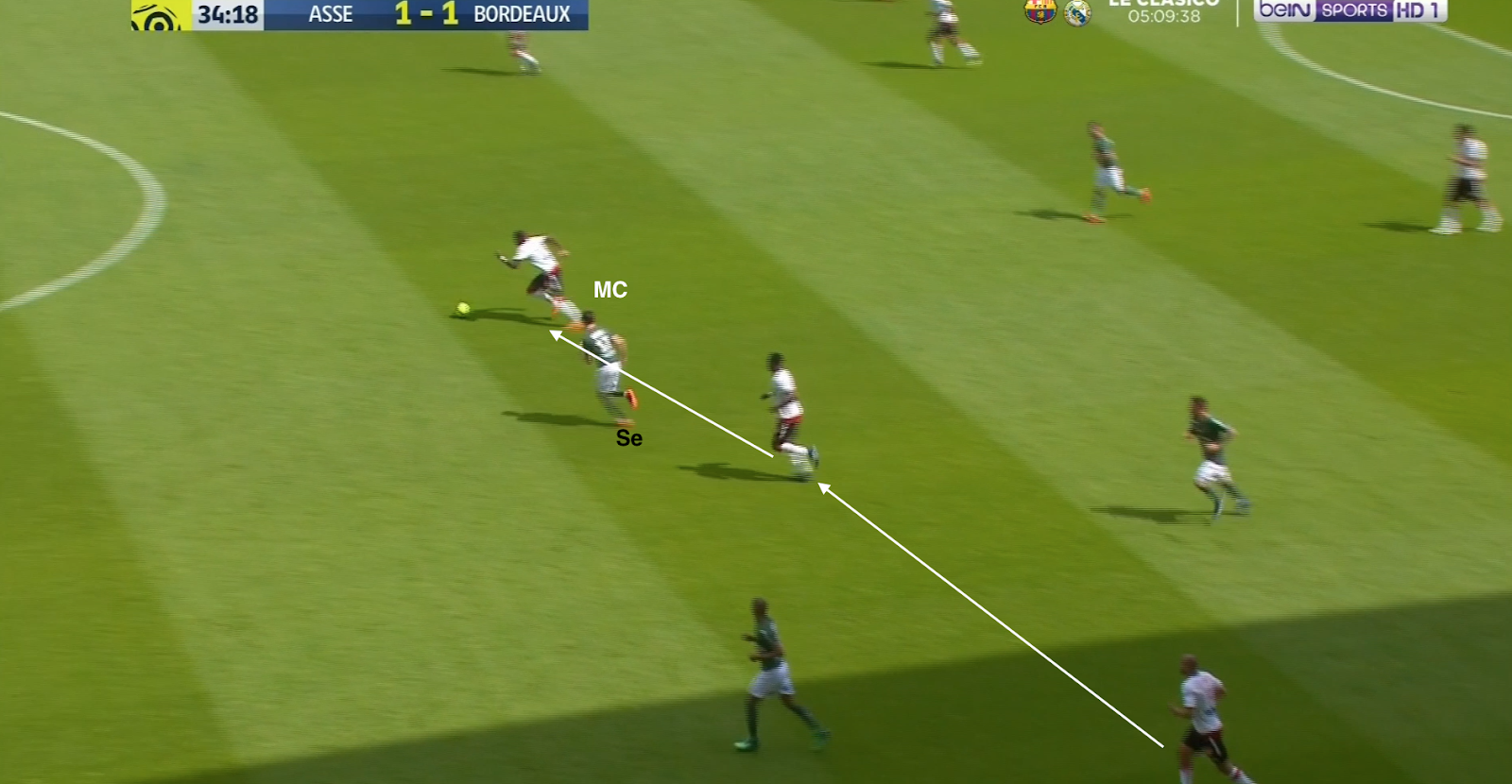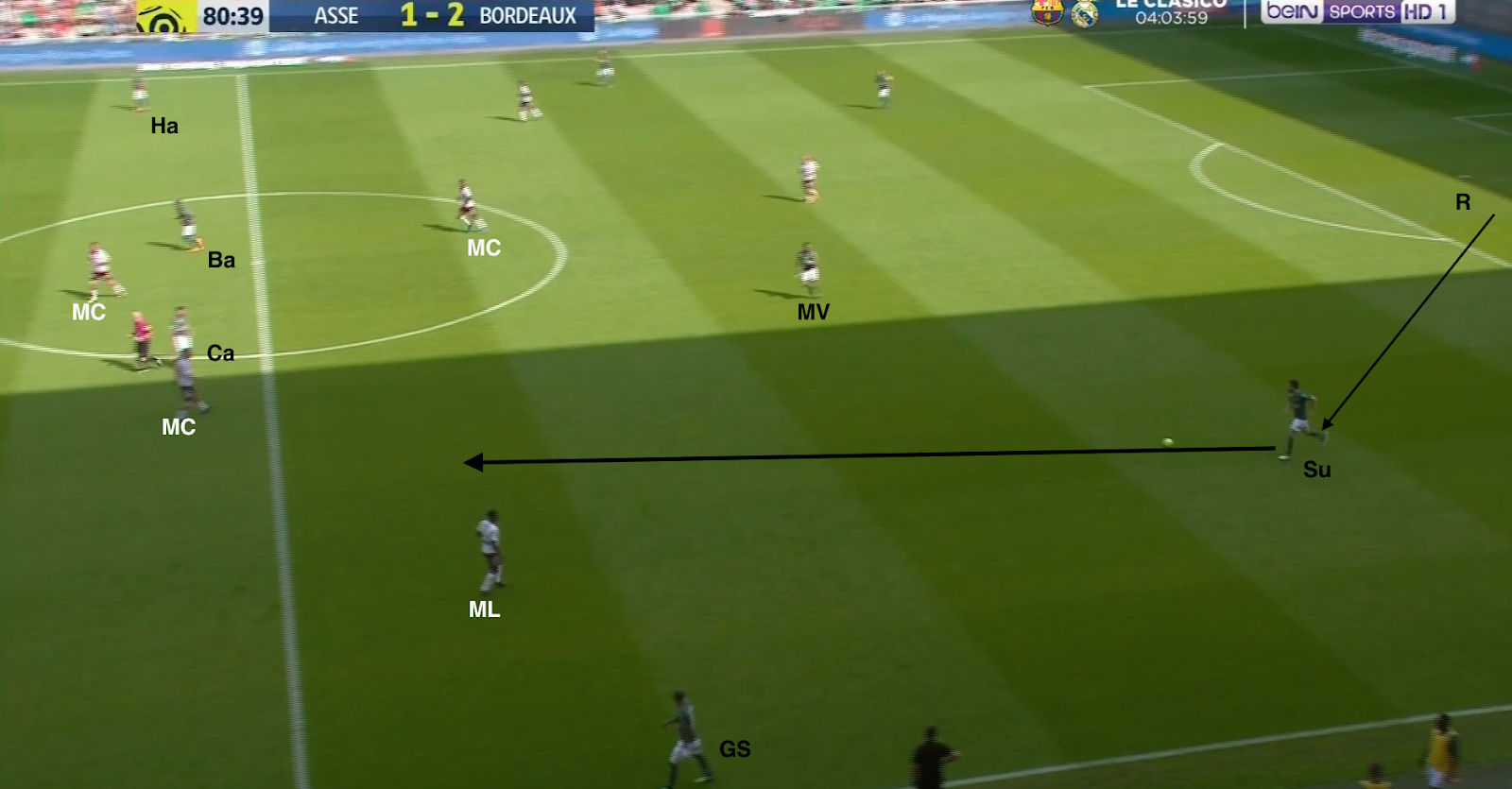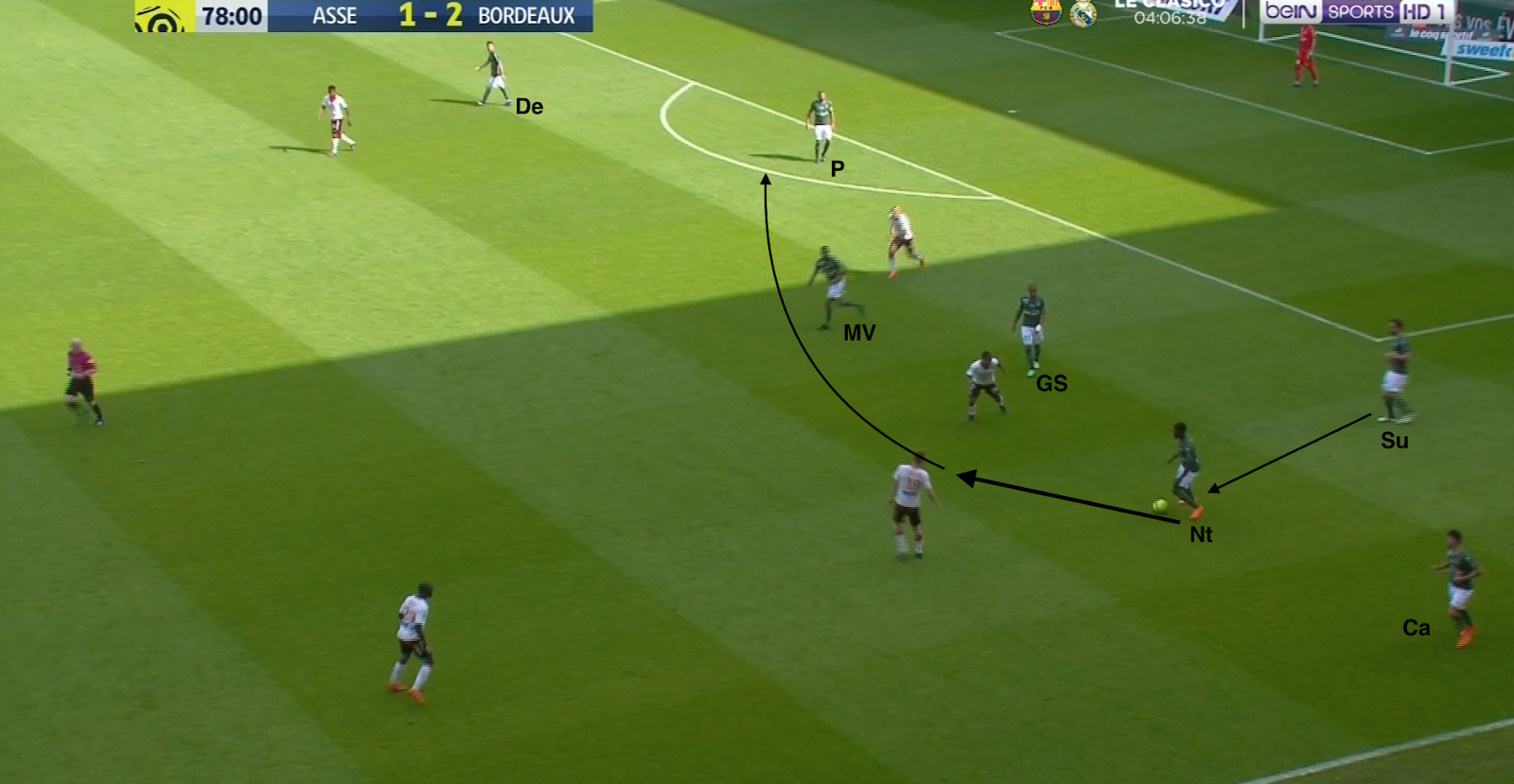 Perrin se trouve dans une position de meneur de jeu (et Cabella de défenseur central). L'adversaire qui se trouve à terre n'a pas d'influence sur cette action, il y a trois stéphanois autour de lui (M'Vila, Cabella et Subotic). Il y a des 2-contre-2 dans chaque couloir, Beric est entouré de 3 adversaires... il n'y a aucun décalage fait, sauf que l'appel de Bamba est parfaitement effectué dans l'espace libéré par le latéral adverse, tout comme la passe du capitaine, qui le trouve à l'entrée de la surface. Malheureusement sa frappe trouve le poteau...