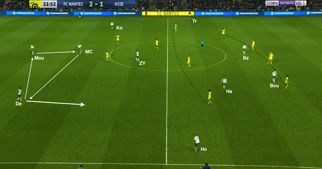 Quand ils eu la possession, les Verts ont principalement essayé de passer par les côtés. Soit en rajoutant un 2e joueur au piston, dans le dos de l'ailier adverse, pour jouer à 2-contre-1 sur le latéral. Soit en resserrant la défense (attirant le latéral vers l'axe) pour libérer le couloir pour le piston. Mais les Canaris attaquaient aussi par les côtés et l'aide des offensifs stéphanois était importante quand la possession était nantaise. Ce qui a souvent été le cas en 2MT, 67% de possession pour Nantes jusqu'au 3e but stéphanois. L'entrée de Khazri à la place de Hamouma n'a rien changé au système :