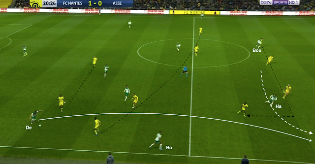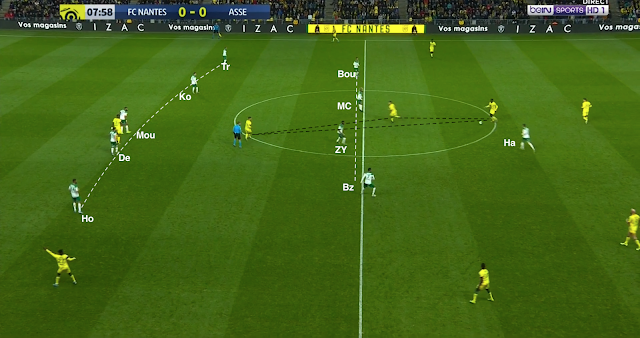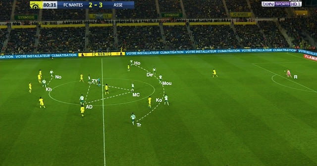 Les Verts proposent donc une ligne de 4 au milieu et comme le latéral de son côté est pris par Boudebouz, Honorat peut s'occuper de l'ailier. Quand celui-ci est recherché par une passe en profondeur, il couvre, mais concède un corner. Qui représente le tournant du match : les Nantais trouvant d'abord la transversale de Ruffier, qui gagne ensuite un face-à-face avec un adversaire après un ballon perdu par Boudebouz. Et la suite est pour les Verts, même s'ils perdent initialement le ballon et Nantes repart à l'attaque :