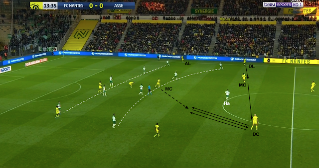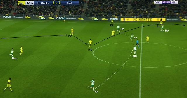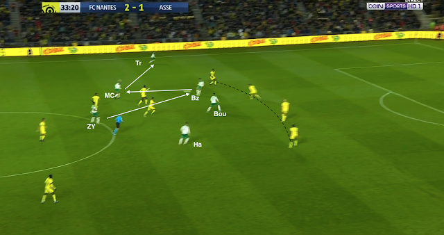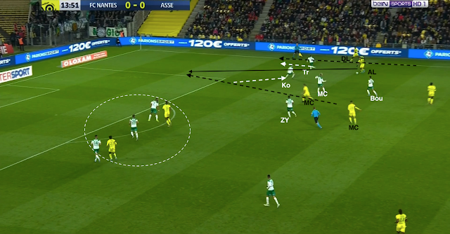 Du côté gauche, Bouanga a été bien plus souvent au marquage de son latéral, mais pas toujours, comme dans cet exemple peu avant au quart d'heure de jeu, qui commence avec une touche nantaise :