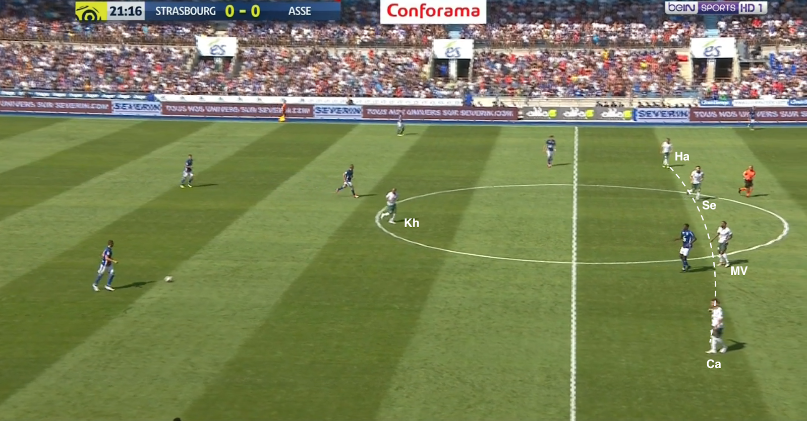 ... avant de le redonner à Cabella, toujours assez bas. Sur cette image on peut voir les trois autres offensifs, Khazri en ailier droit, Hamouma en ailier gauche et Diony en avant-centre, ainsi que Selnaes (pris par un milieu axial) qui se trouve plus haut que Cabella (qui avait réussi à se défaire de son milieu axial). La dernière recrue des Verts à donc le champ libre devant lui et monte avec le ballon :