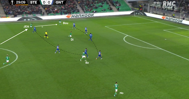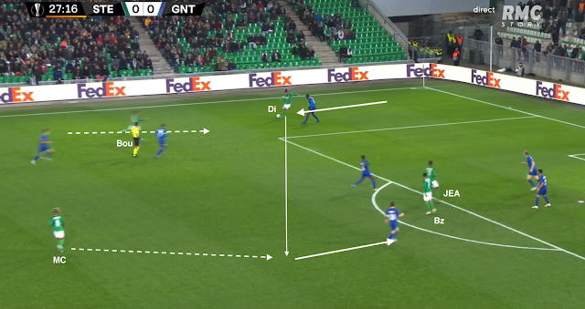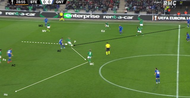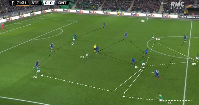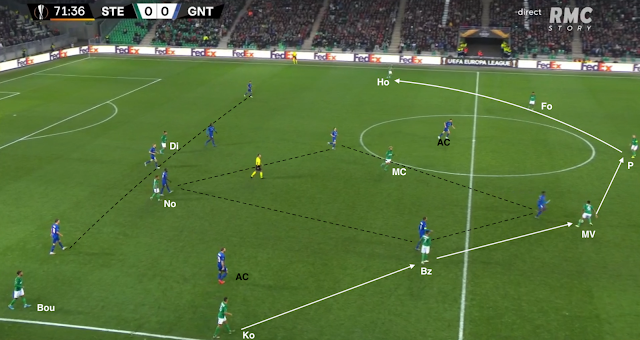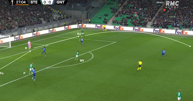 Il reçoit le ballon de Bouanga, qui va plus haut dans le couloir, avant de servir Kolo, qui monte de la défense. La Gantoise joue dans un 4-4-2 losange, donc avec un seul jouer de côté, le défenseur latéral. Si les Verts y mettent un deuxième, c'est un avant-centre qui vient couvrir, surtout que les milieux sont au marquage des axiaux stéphanois (et de Nordin, positionné comme un "10") :