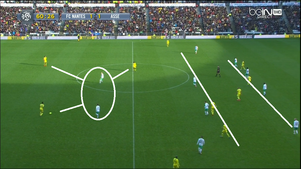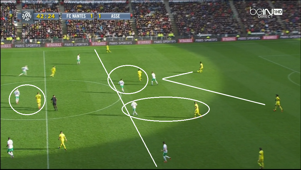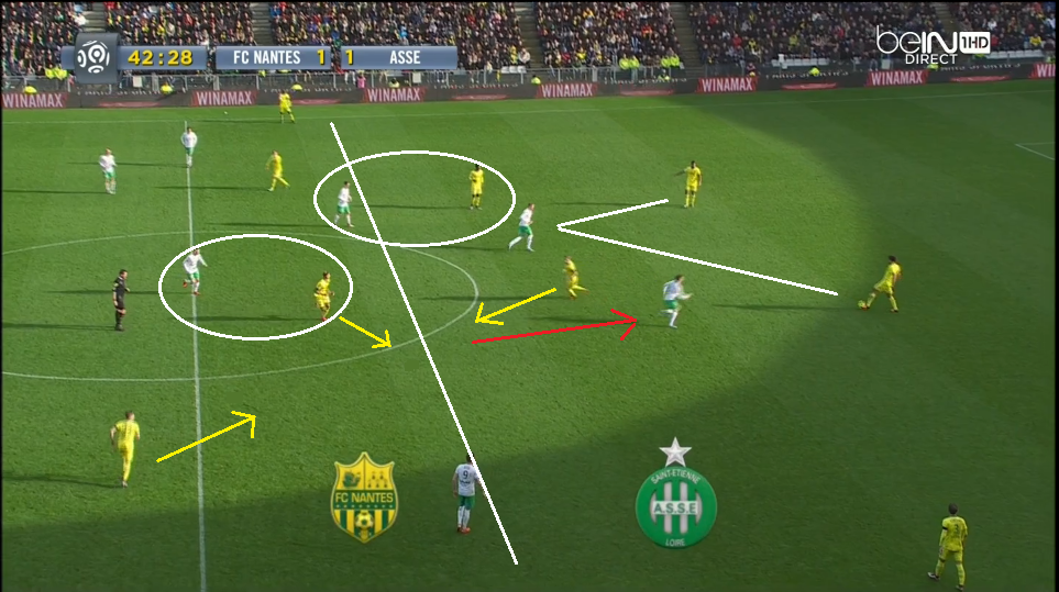 L'idée de faire du pressing n'est pas mauvaise, mais il faut le faire tous ensemble, ou mieux organisés. Comme il y a deux verts qui pressent deux défenseurs, il y a un milieu nantais qui se retrouve seul - au bout de 2 passes simples le ballon lui arrive dans l’entre-jeu...