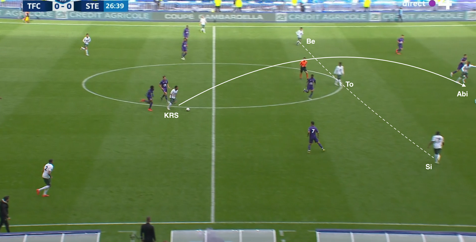 Après l'ouverture du score, les Verts ont clairement fait un pas en arrière et on laissé la possession au TFC, préférant les contres, comme dans cet exemple à la 62e :