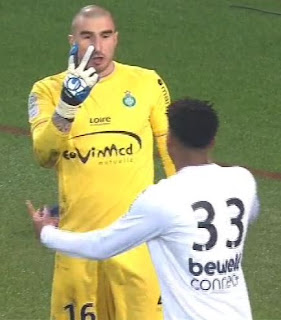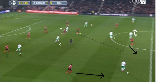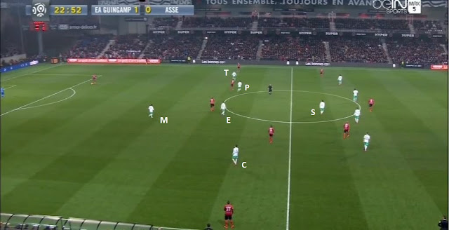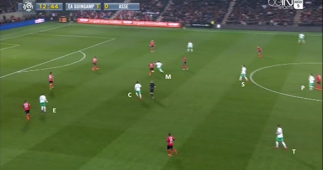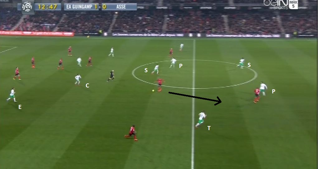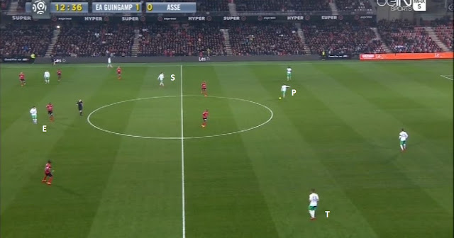 Et là, c'est le drame: le milieu défensif de Guingamp récupère le ballon. Ça arrive, ce n'est pas grave: le bloc défensif stéphanois n'est pas en place, mais les deux défenseurs centraux ont un seul attaquant à gérer (on ne les voit pas à l'écran), l'autre attaquant est serré par la sentinelle - Pajot (P) dans ce cas - et 9 des 10 joueurs adverses sont dans leur propre moitié du terrain.