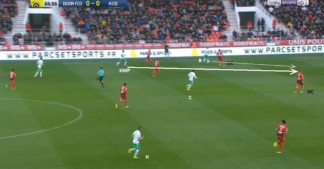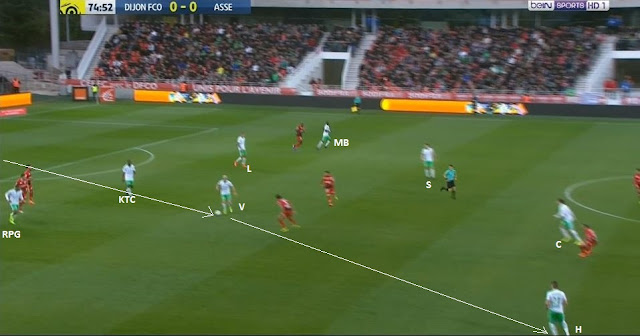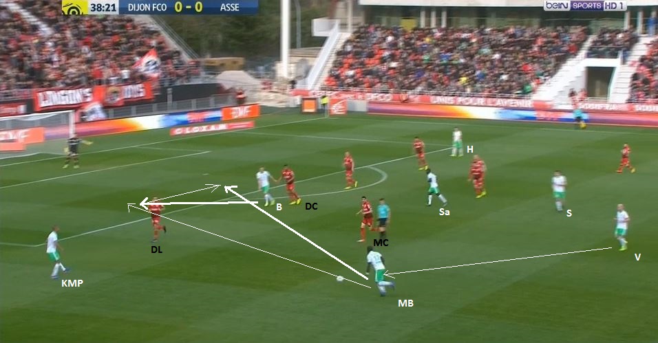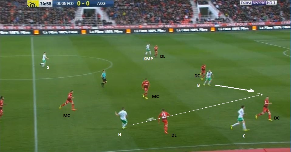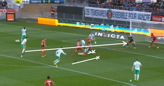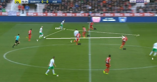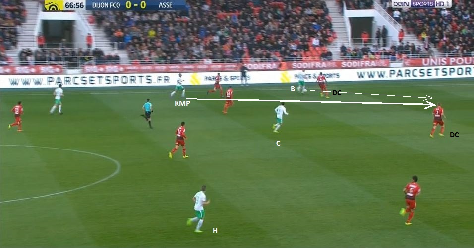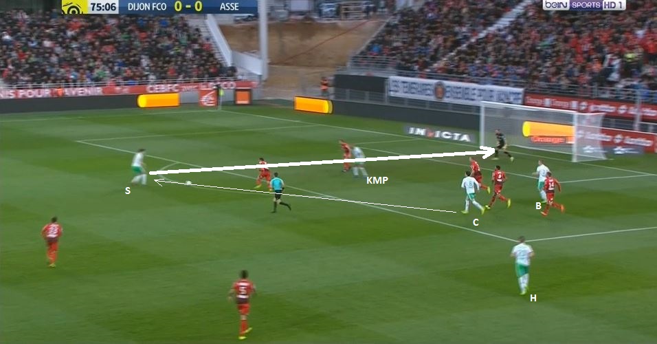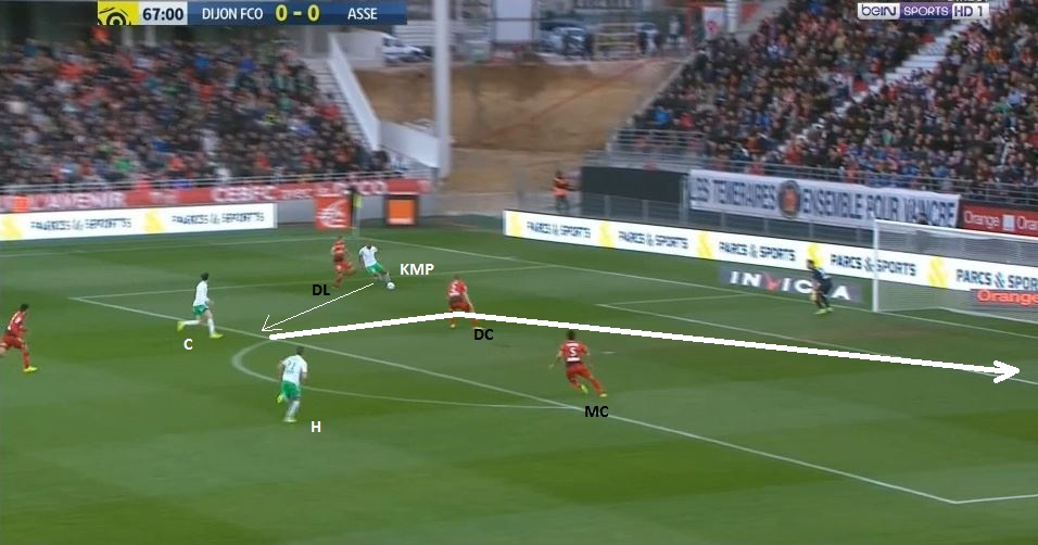 Si Beric est dans le couloir avec le ballon, il est suivi par son défenseur et KMP fait un appel entre les centraux, bien servi dans la course par le Slovène :