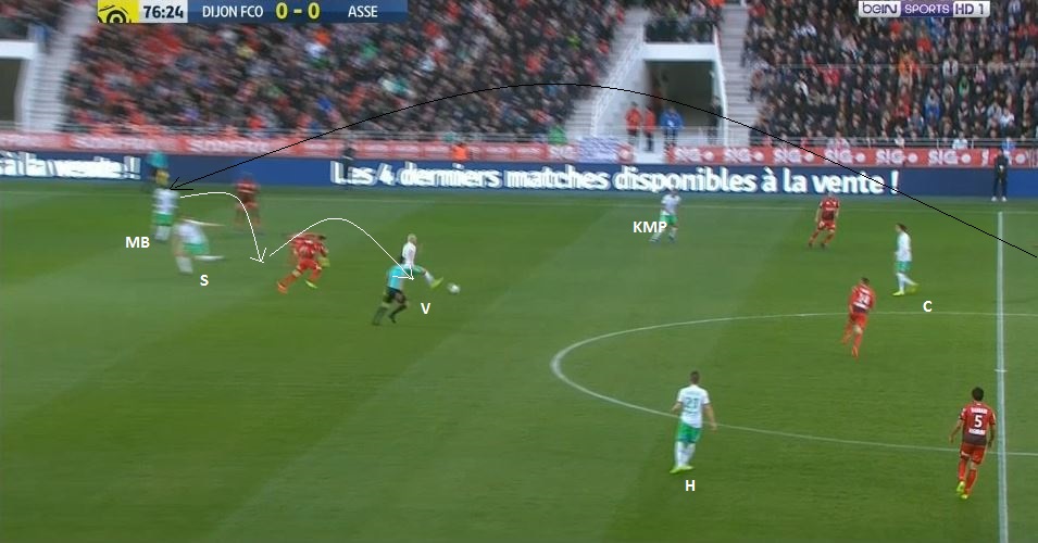 Veretout lance Hamouma dans son couloir, Beric vient l'aider, le un-deux échoue et Beric finit par perdre le ballon :
