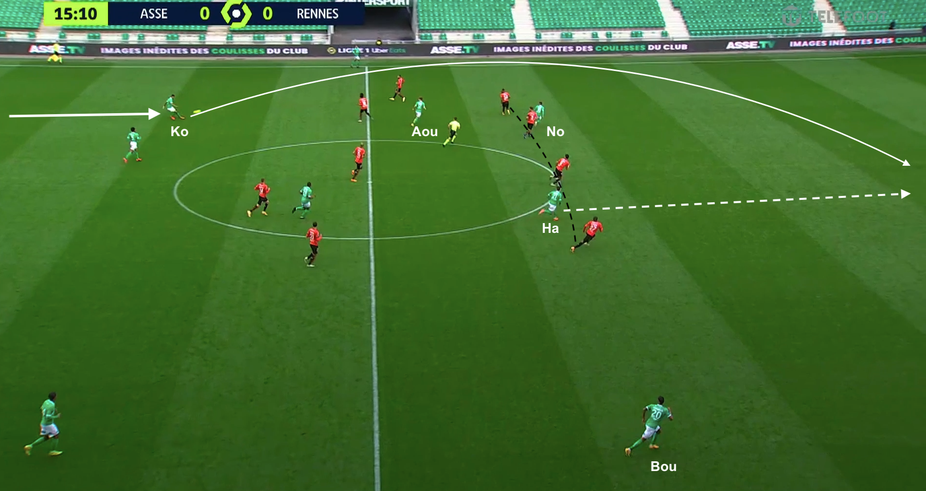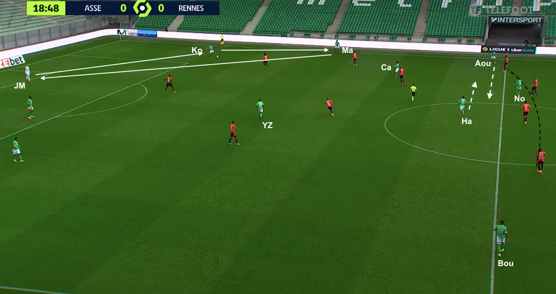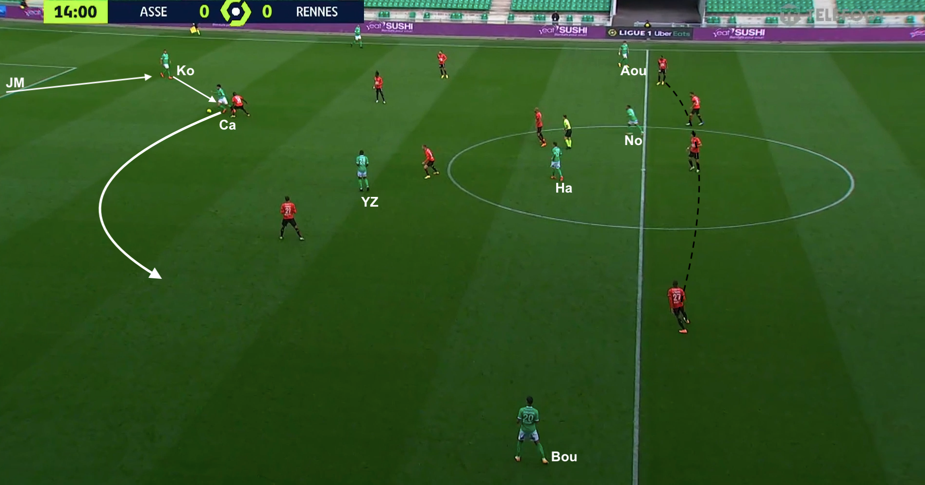 Après des échanges de passes avec son gardien et avec Moukoudi, Kolo monte balle au pied. En face, la défense est toujours très haute et les Stéphanois sont prêts à des appels dans son dos :